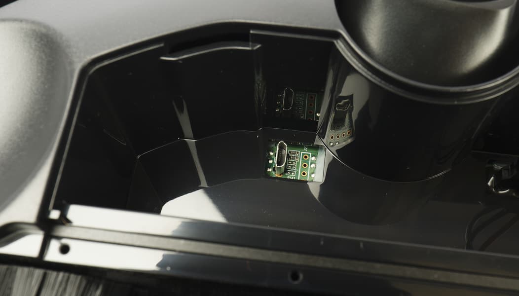 На дне этой части корпуса есть отверстия для воды, протекающей на салфетку при влажной уборке. Система подачи у Viomi V2 Max принудительная: жидкость нагнетается с помощью миниатюрных насосов, размещенных внутри модулей. Для их питания предназначены электроконтакты на стенке отсека.