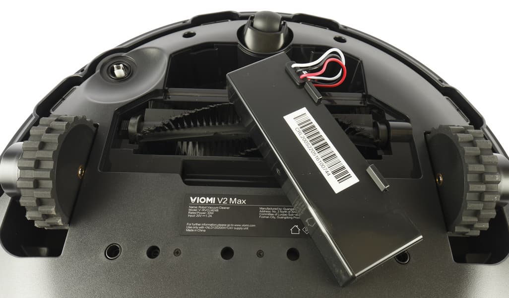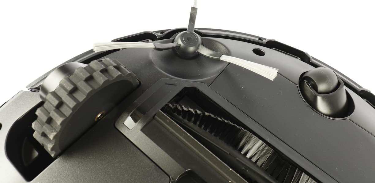 У Viomi V2 Max две щетки. Центральная располагается между ведущими колесами и снабжена тремя V-образными рядами жесткой щетины. У ее рамки нет никаких приспособлений, препятствующих наматыванию электропроводов: об отсутствии лишних предметов на полу владельцу придется побеспокоиться самостоятельно.