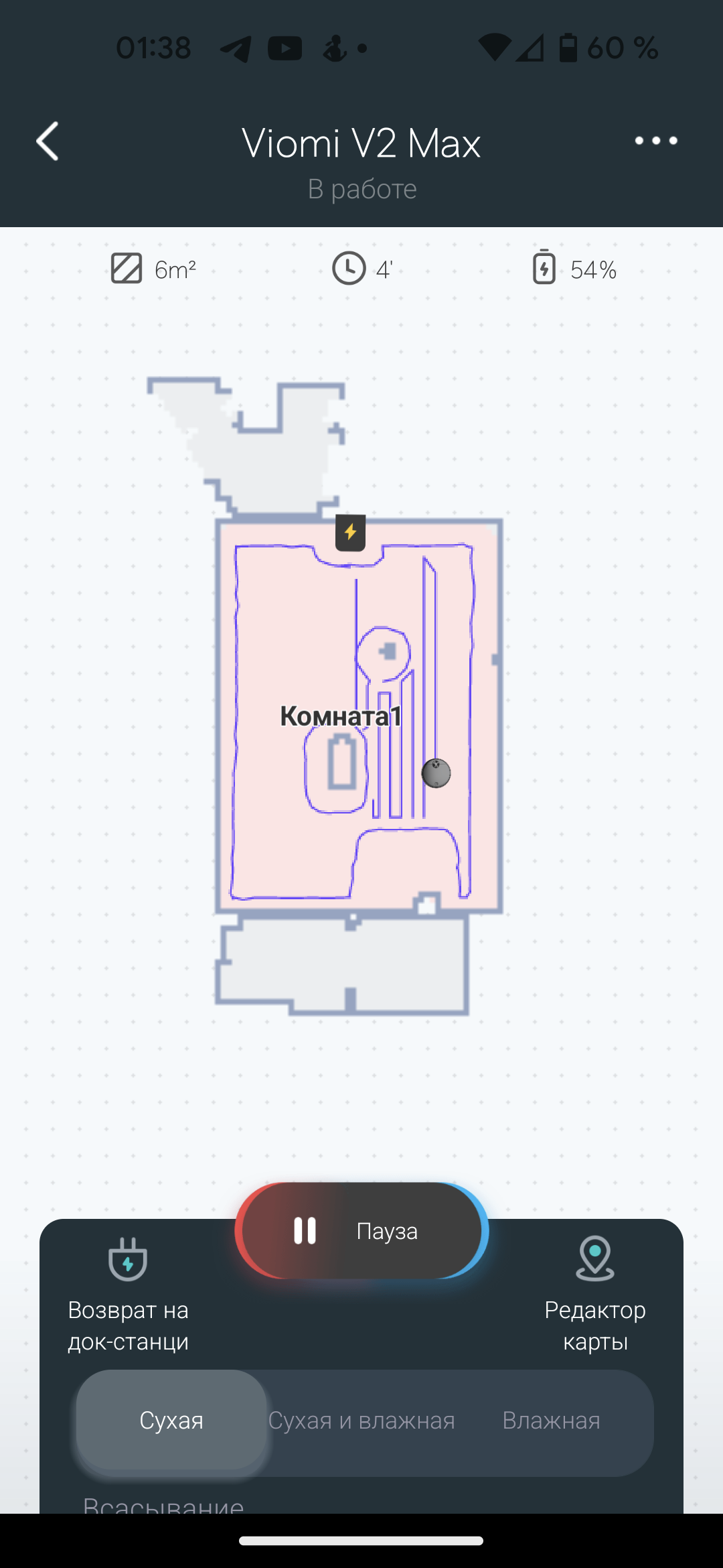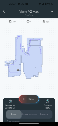 Внизу можно переключать типы уборки (сухая/влажная/сухая и влажная) и режимы работы (четыре уровня мощности). Между этим разделом и картой есть еще кнопки возвращения на базу и вызова редактора карт — напомним, он станет доступен только после первой автоматической уборки.