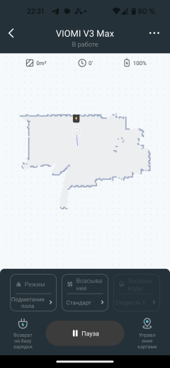 На главном экране приложения мы видим карту помещения, создаваемую с весьма высокой точностью: LDS-сенсор позволяет определять расположение стен и мебели с точностью до миллиметров. В верхней части экрана можно следить за состоянием аккумулятора и оценивать площадь, убранную пылесосом в текущем цикле работы.