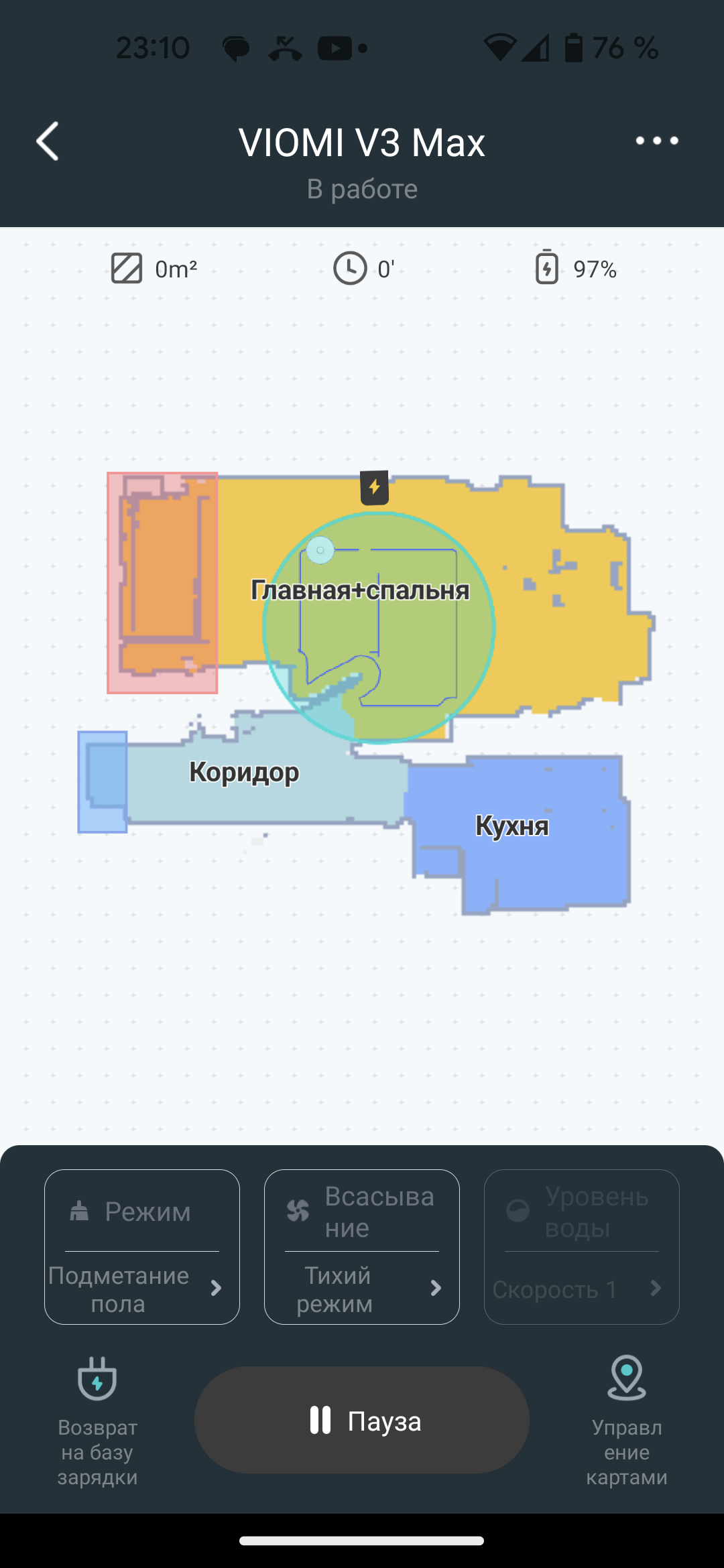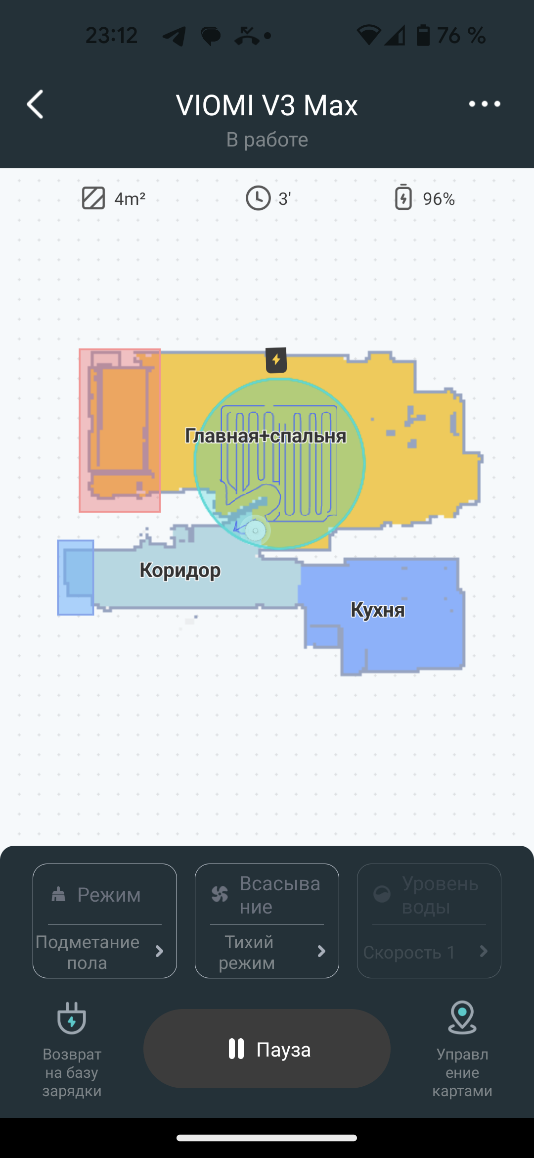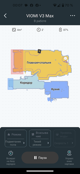 После первой уборки в автоматическом режиме на экране появляется карта помещения. Приложение само разбивает его на комнаты, раскрашивая их в разные цвета. Если такая разметка оказалась неточной, это можно исправить с помощью инструмента «редактор карт».