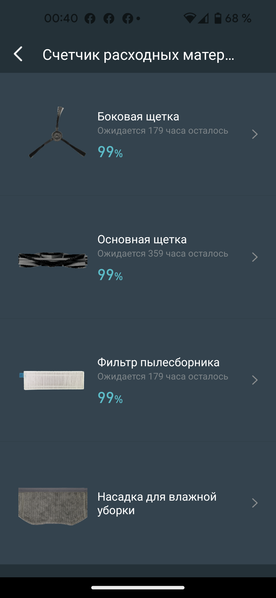 «Счетчик расходных материалов» позволяет следить за состоянием сменных аксессуаров: щеток, фильтров и насадок для влажной уборки.