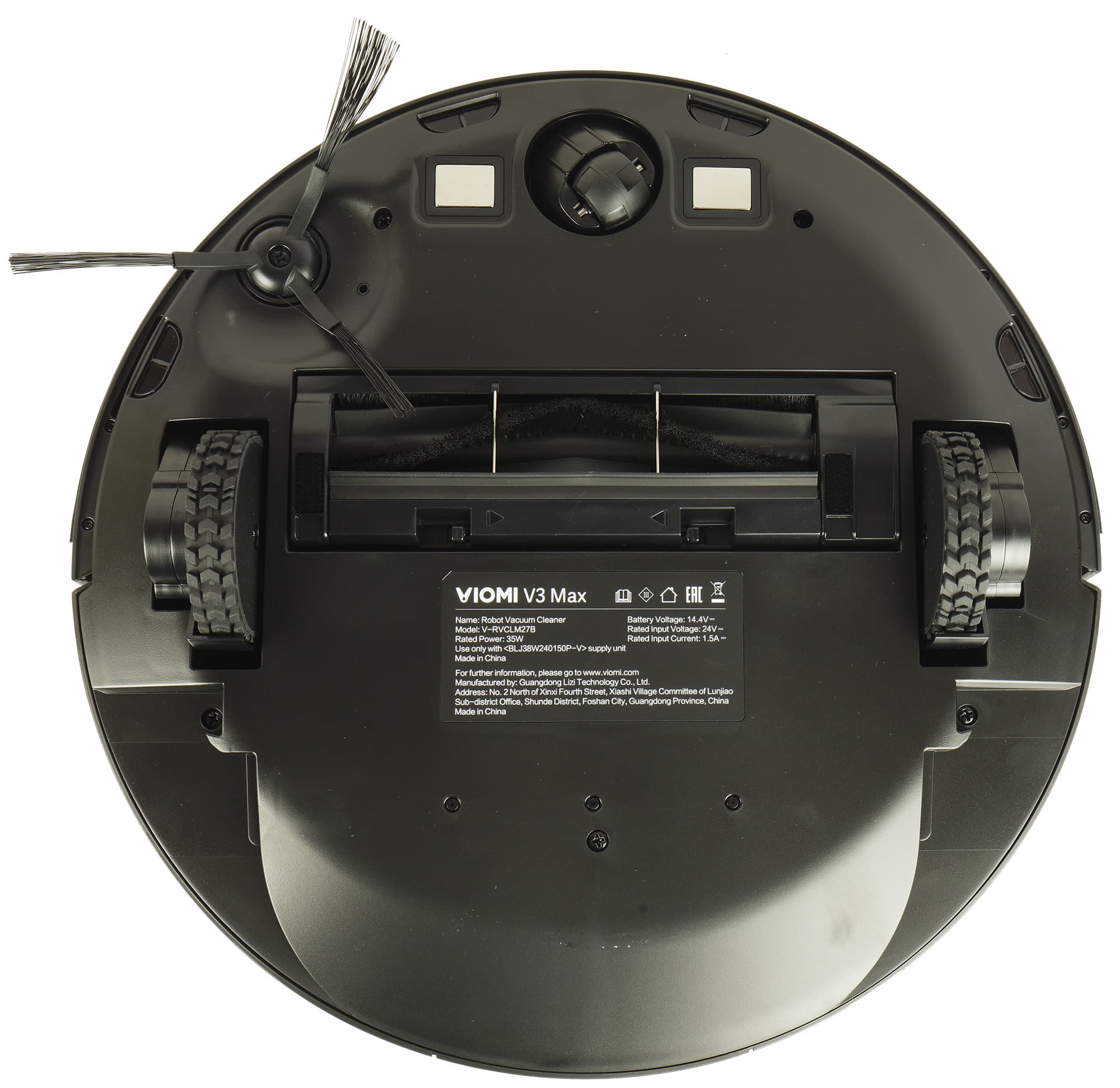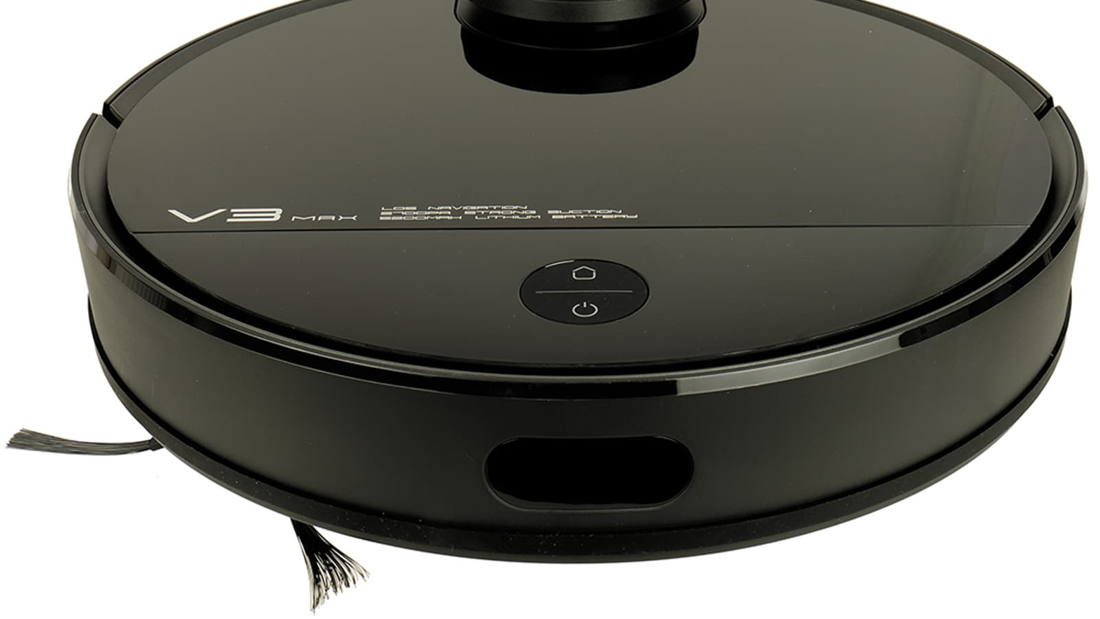 Как и у большинства роботов-пылесосов, у Viomi V3 Max корпус круглый. Но есть существенное отличие, и оно сразу бросается в глаза: башенка лидара расположена не в центре верхней панели, а у заднего ее края. Возвышение, внутри которого вращается лазерный дальномер, закрыто крышкой с логотипом производителя, придающей устройству индивидуальность.