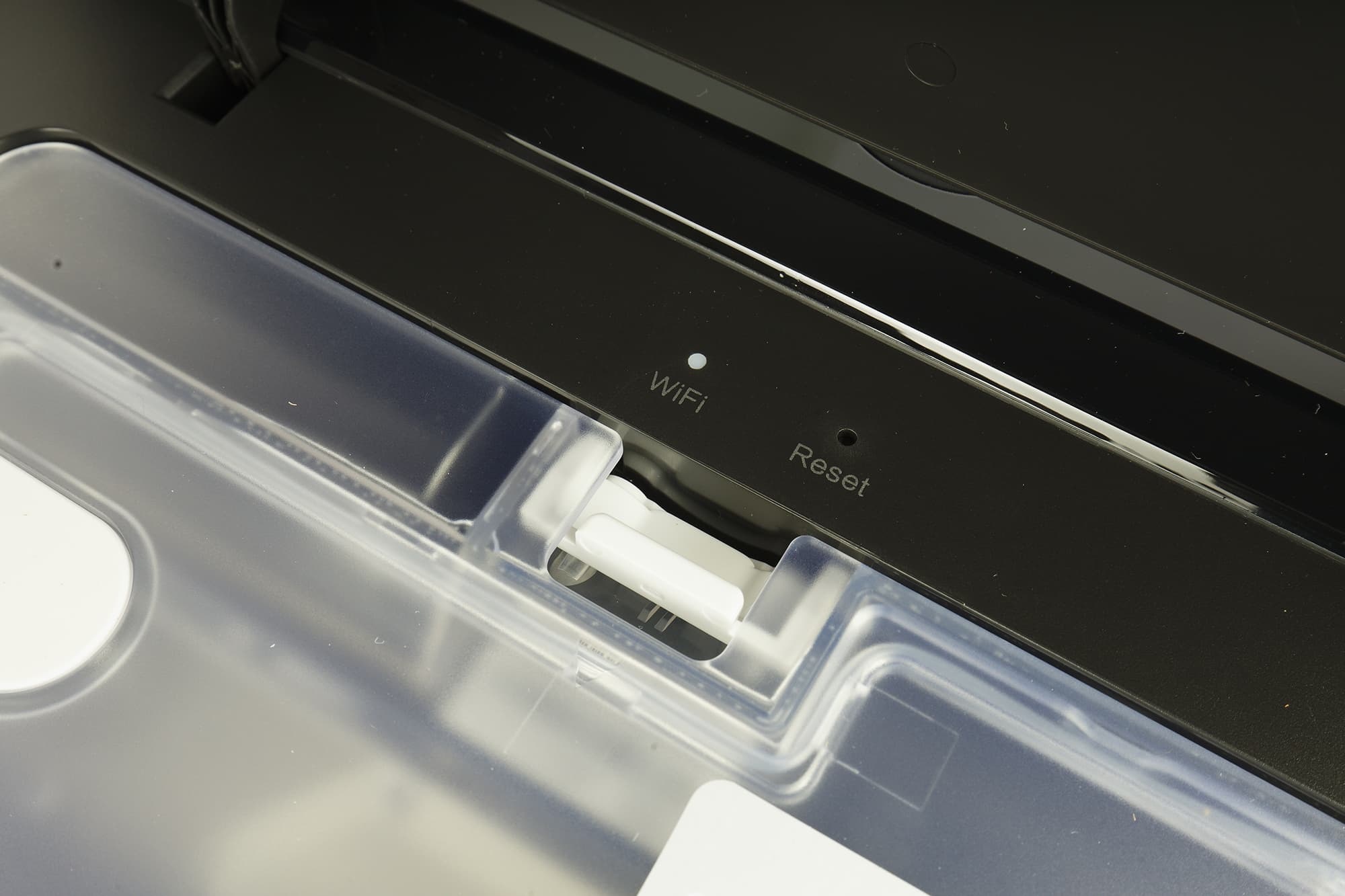 Емкости надежно удерживаются пластиковой защелкой, рядом с которой мы видим утопленную в корпус кнопку сброса и индикатор активности беспроводного интерфейса.