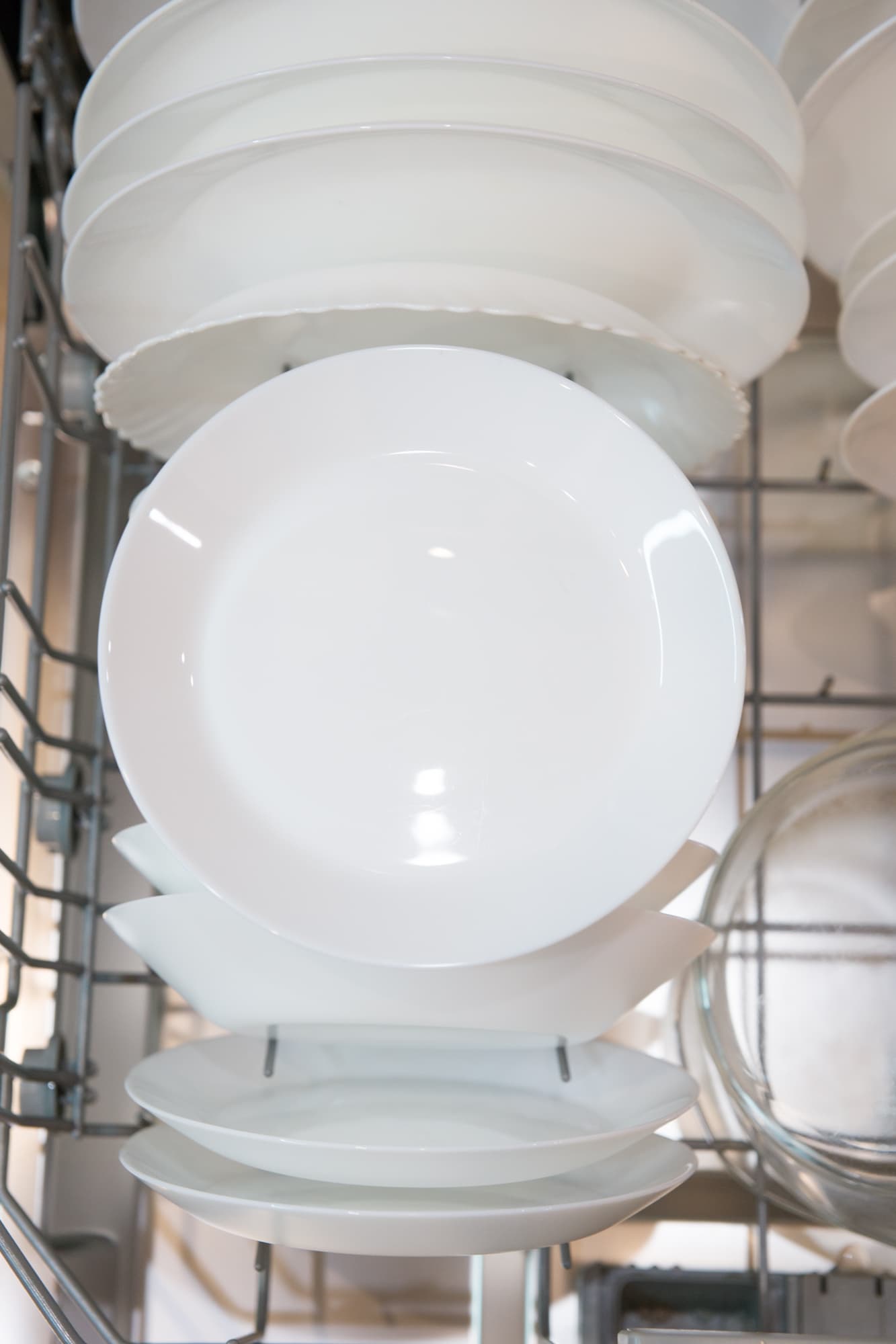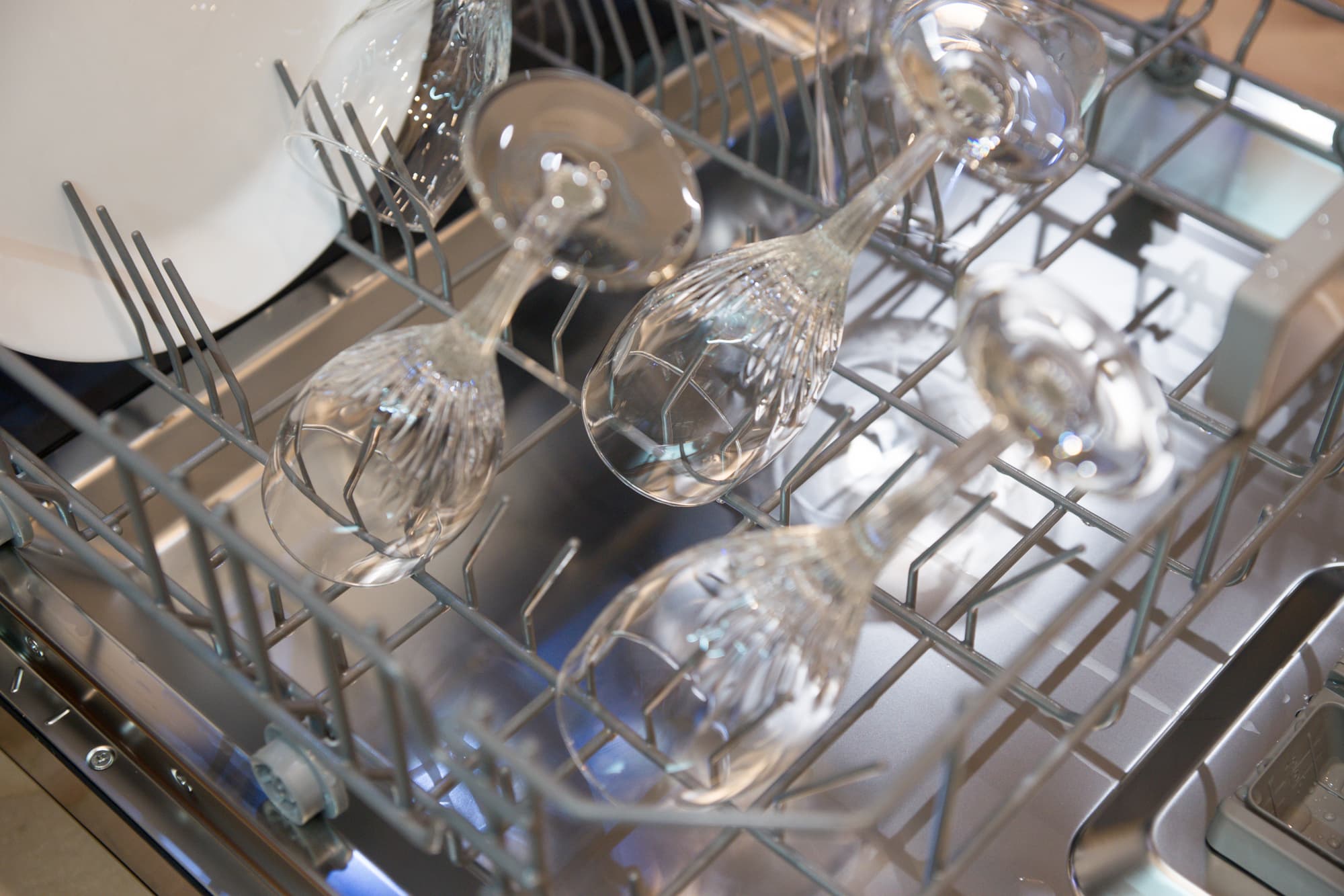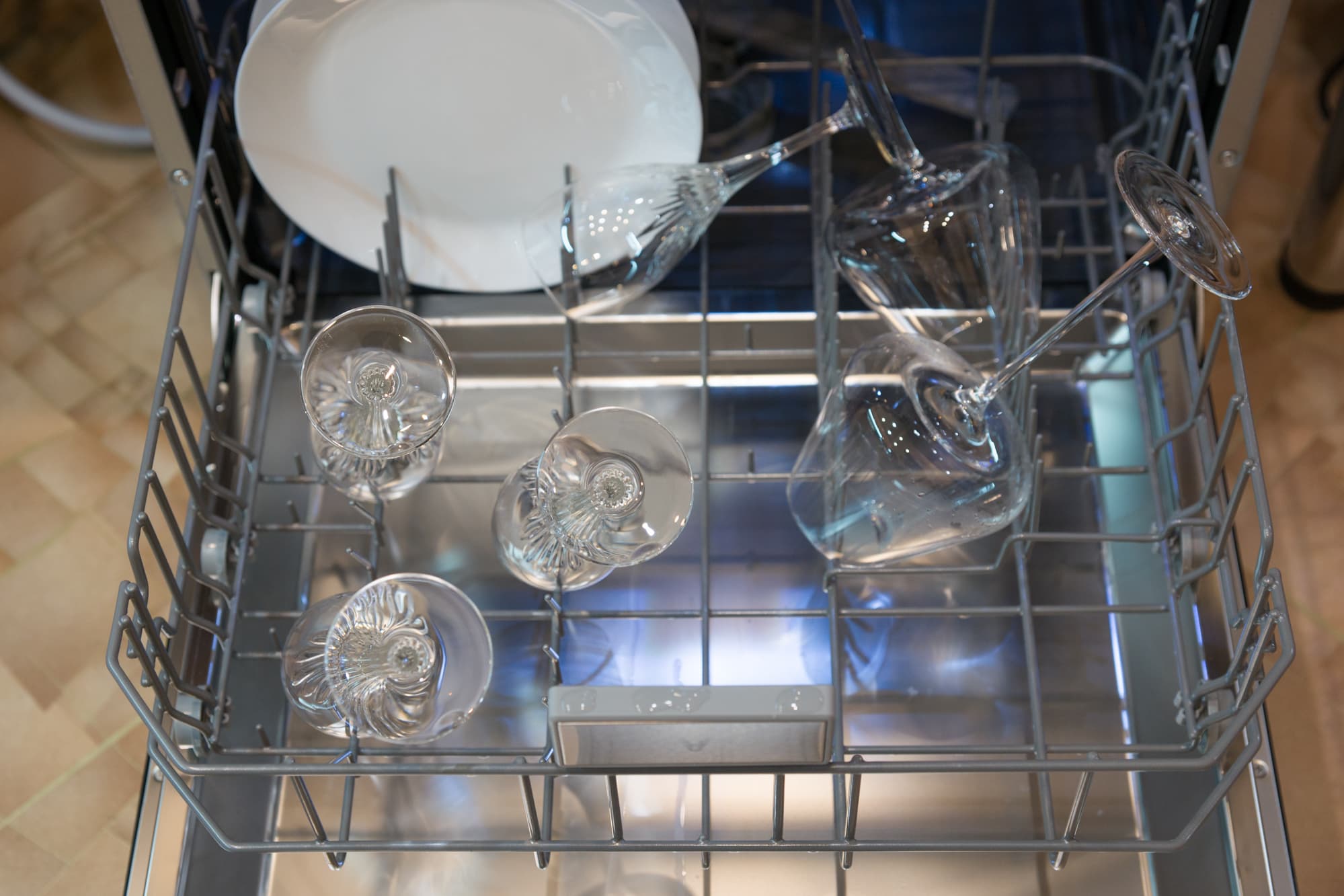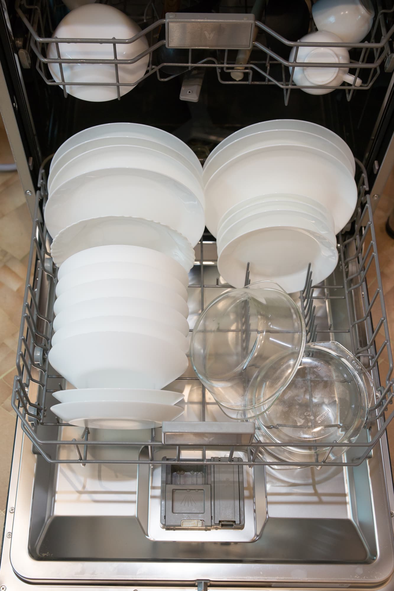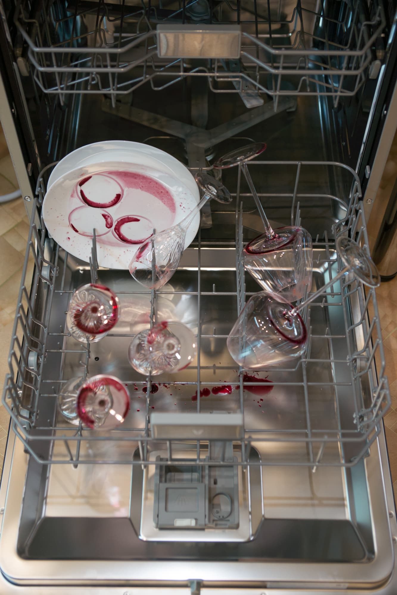 Специальных держателей для бокалов в средней корзине не нашлось, поэтому мы разместили все предметы внизу. Тарелки с винными следами поместили туда же.