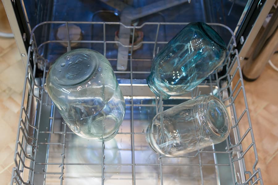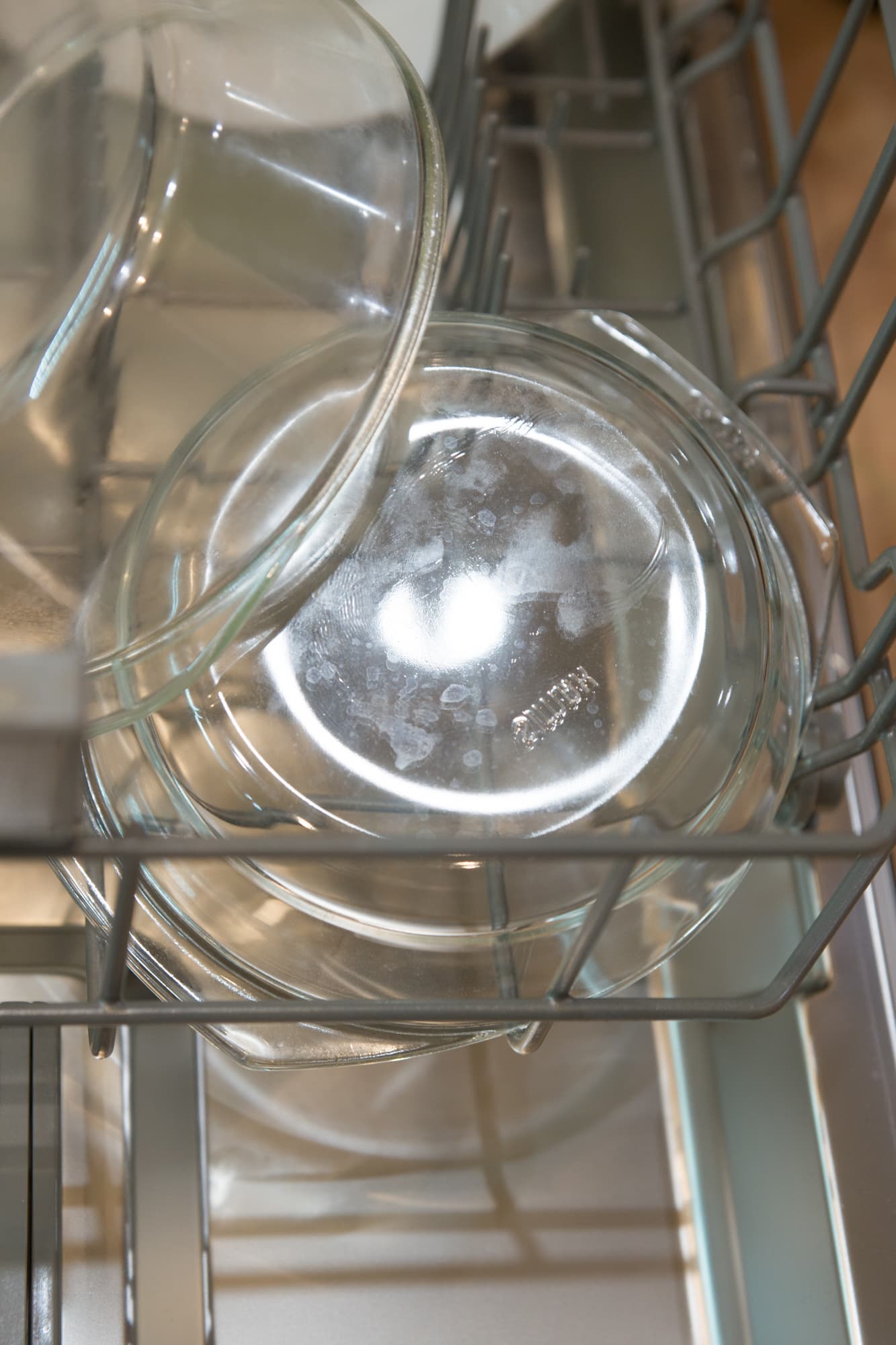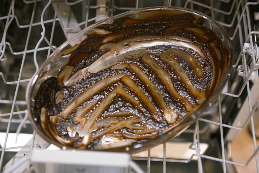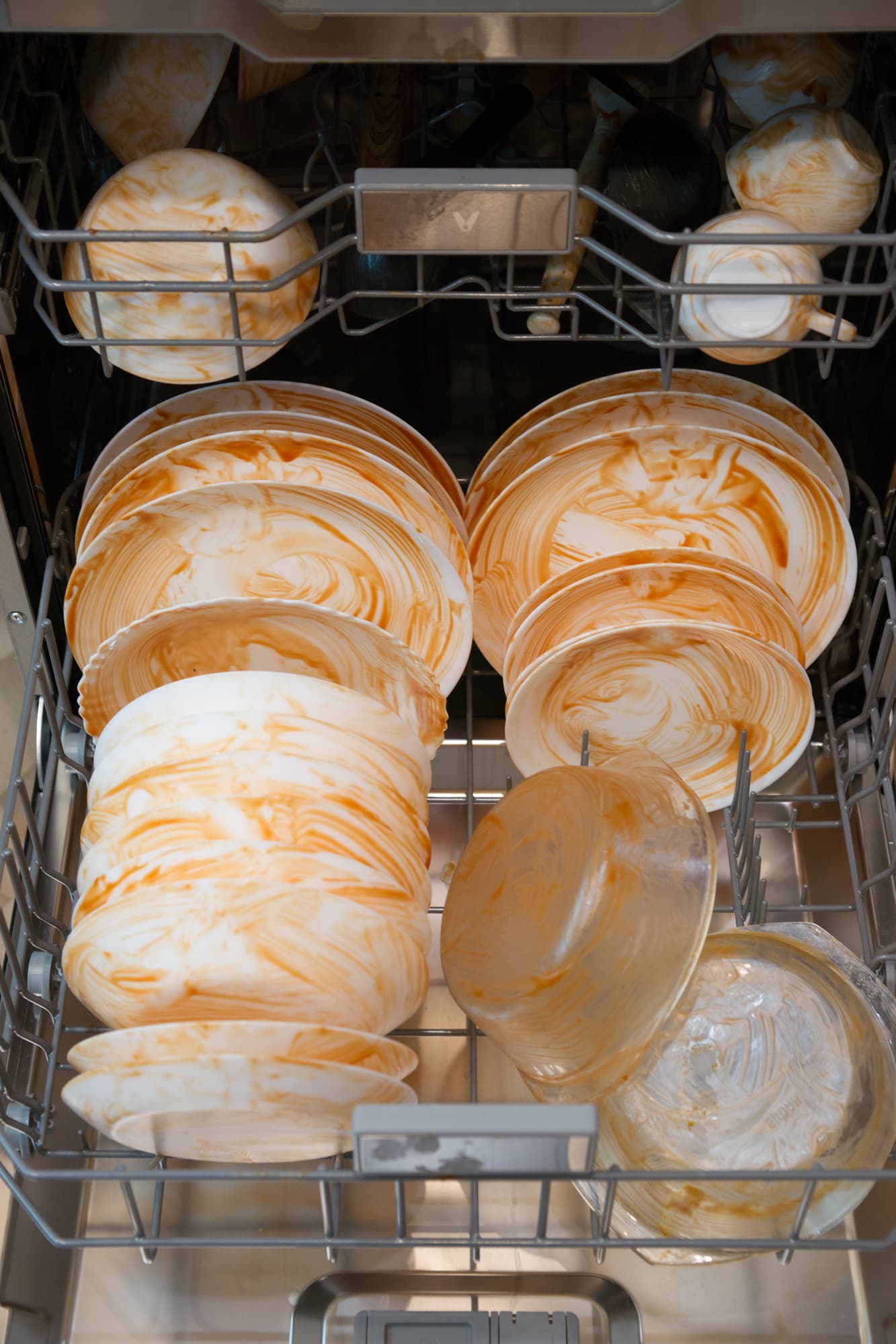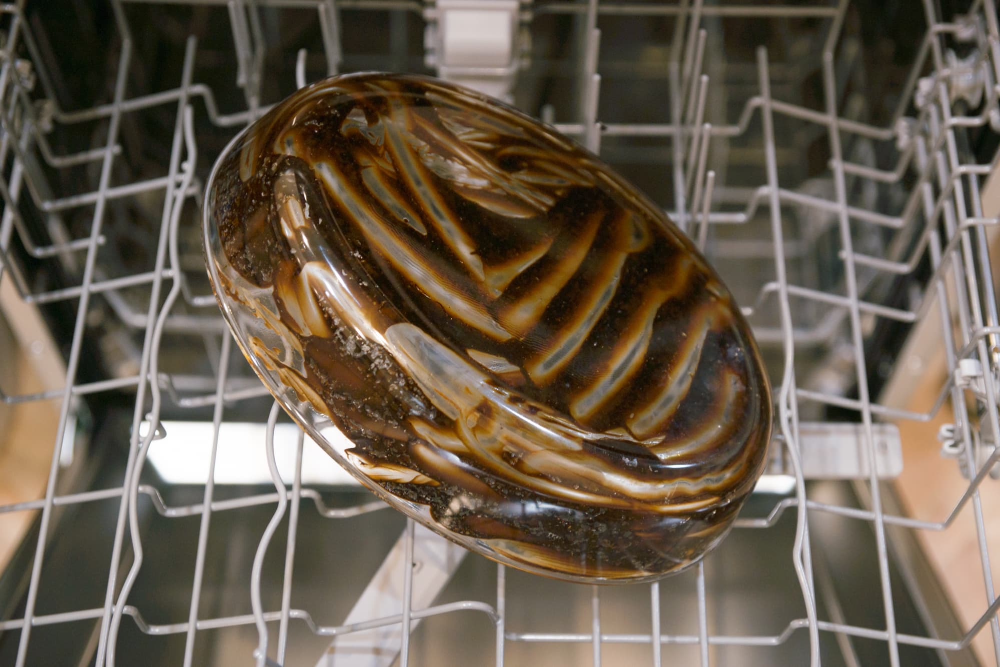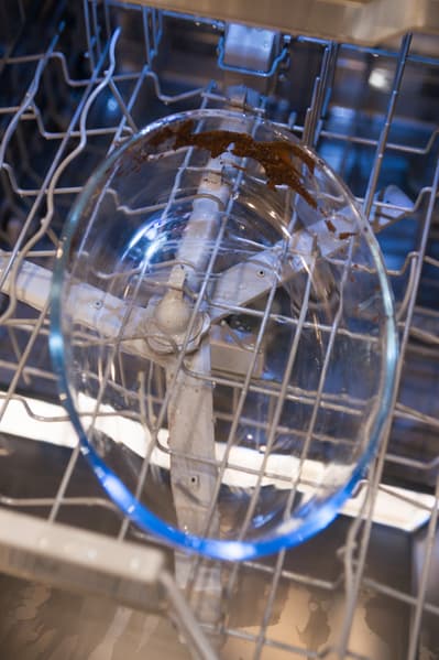 Естественно, такую посуду стоило бы предварительно замочить и только потом отправлять в посудомойку, но здесь нашей целью было максимально усложнить задачу, поэтому мы просто разместили емкость без предварительного очищения вверх дном в средней корзине и включили режим интенсивной мойки.