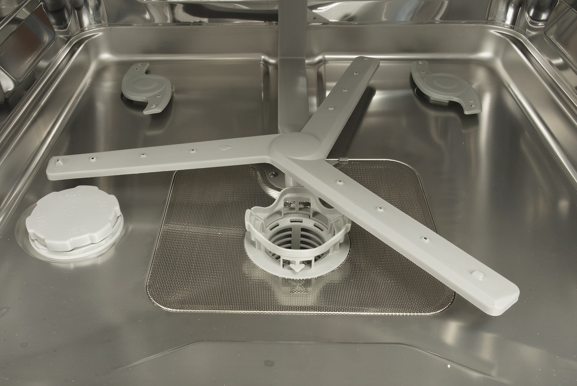 Распыление воды на 360° происходит на трех уровнях. На дне бака находится один крупный импеллер и два дополнительных. Рядом мы видим фильтр стандартной конструкции в виде съемного пластикового элемента вместе с металлической решеткой. По соседству с отверстием фильтра расположена пробка смягчителя с горловиной для засыпания соли.