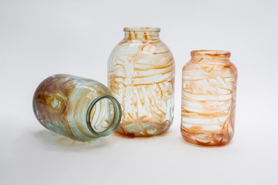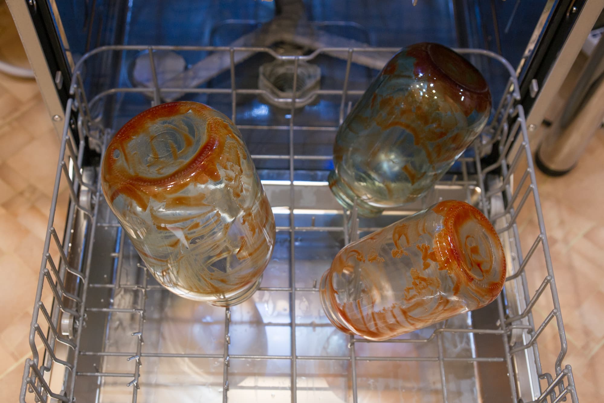 Для тестирования эко-режима, как обычно, мы взяли три банки объемом 3, 2 и 1,5 литра. Запачкали их изнутри кетчупом и дали высохнуть в течение суток.