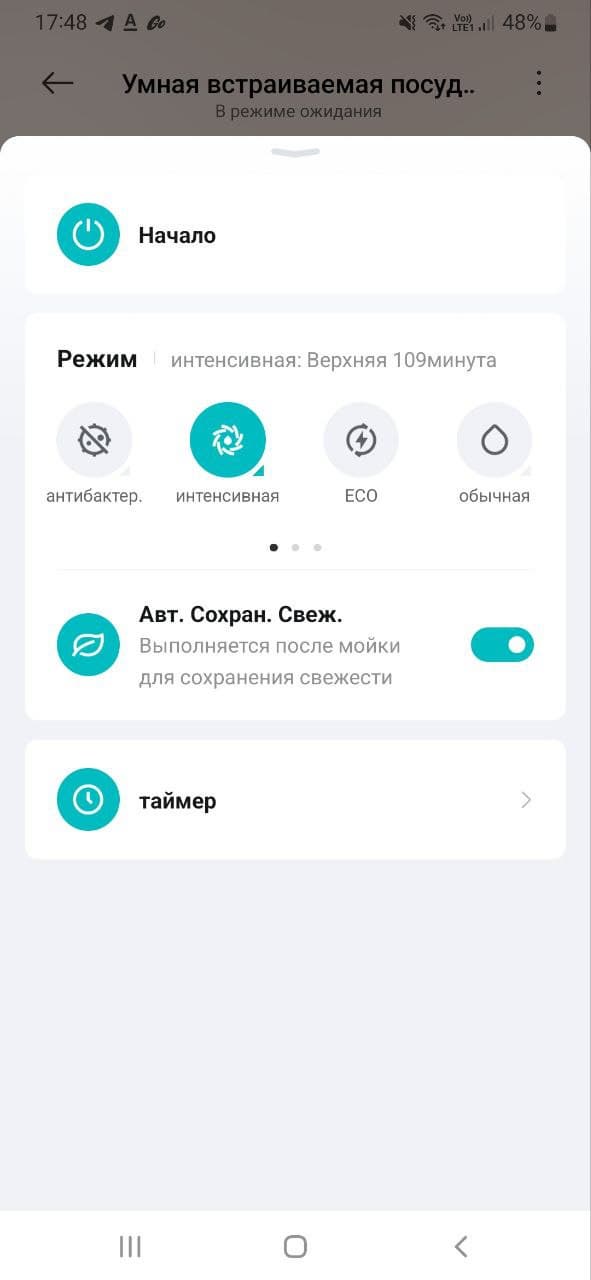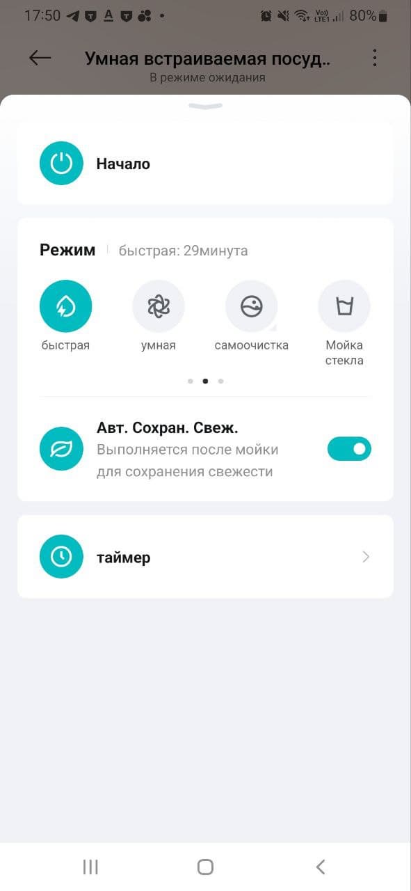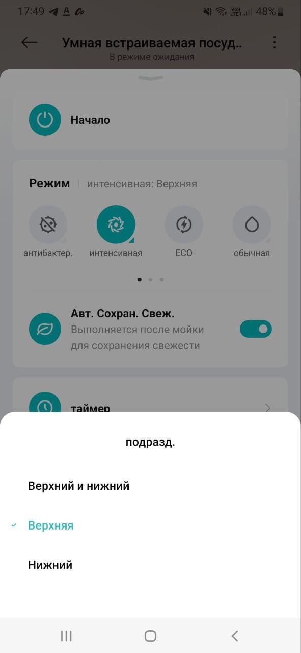 - Половинная загрузка — дает возможность включить или отключить верхние и нижние разбрызгиватели при заполнении половины посудомойки. Работает только в четырех режимах: Антибактериальная (из приложения), Интенсивная, Обычная и Самоочистка.