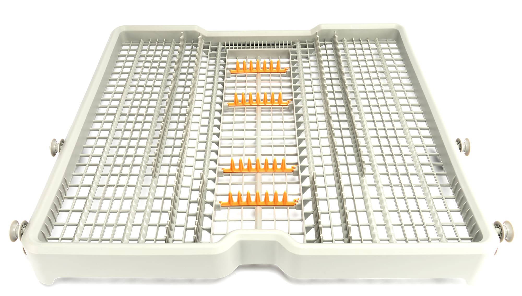 Нижняя корзина традиционно предназначена для кастрюль, сковородок, крупных и средних тарелок. Держатели для тарелок имеют фиксированное положение и складывать их нельзя. Собственно, ни в одной корзине нет складных или съемных элементов.