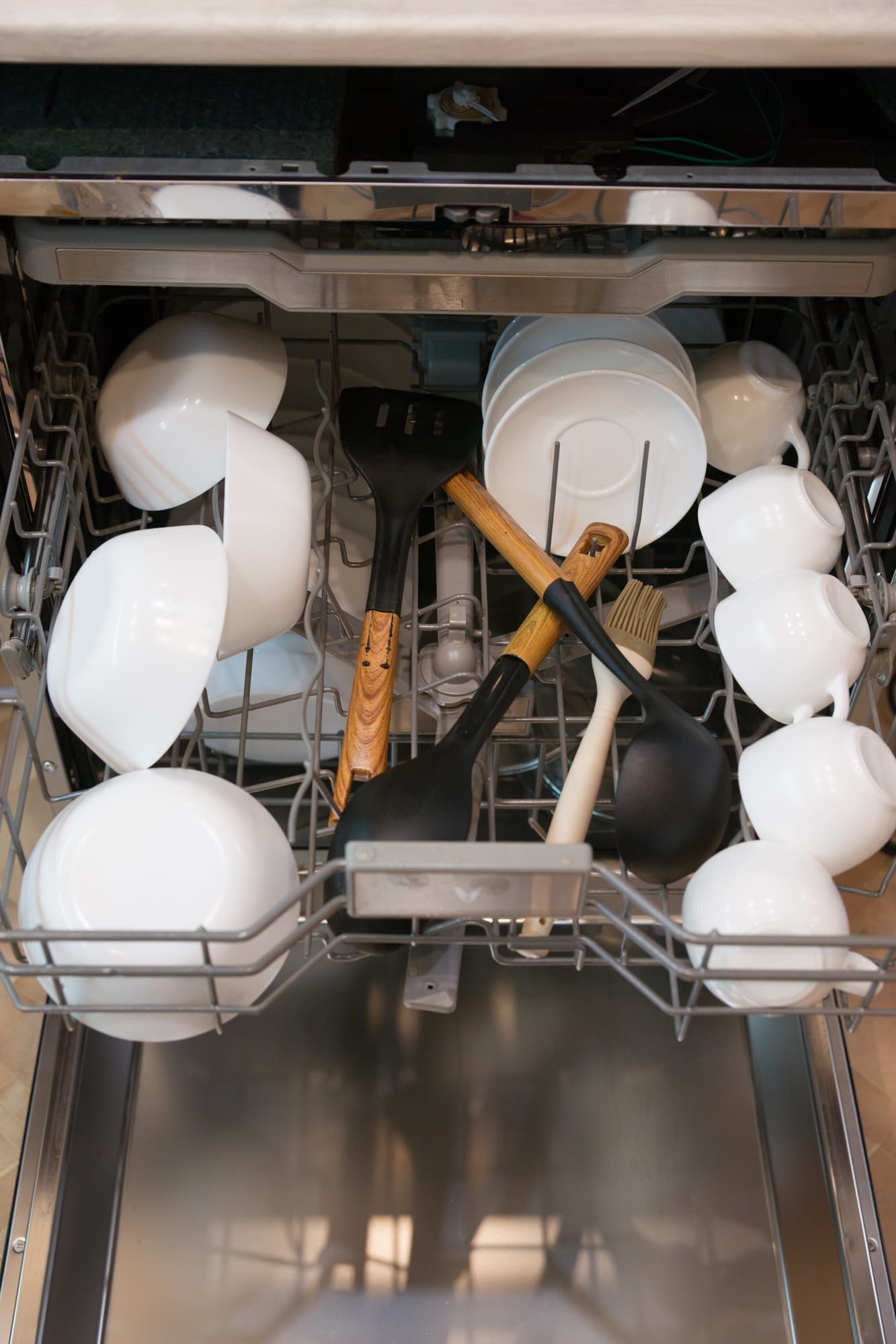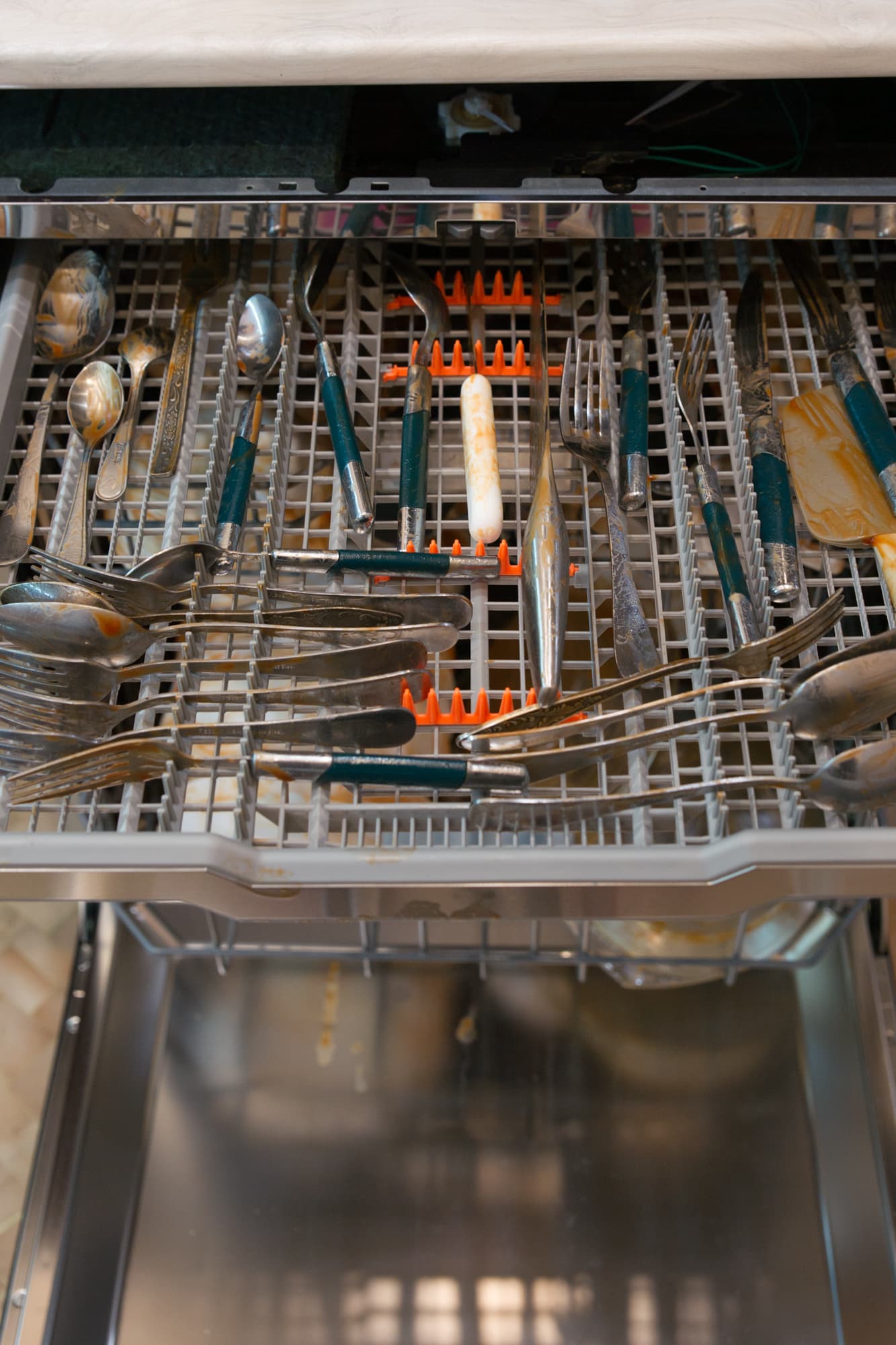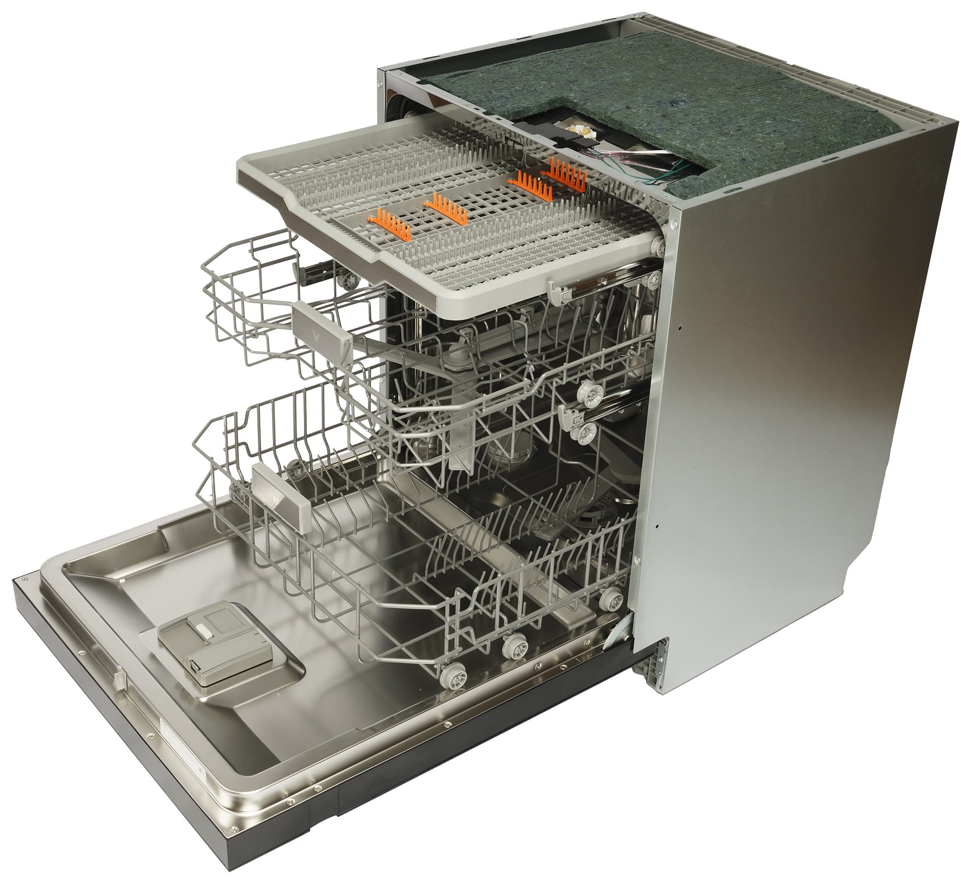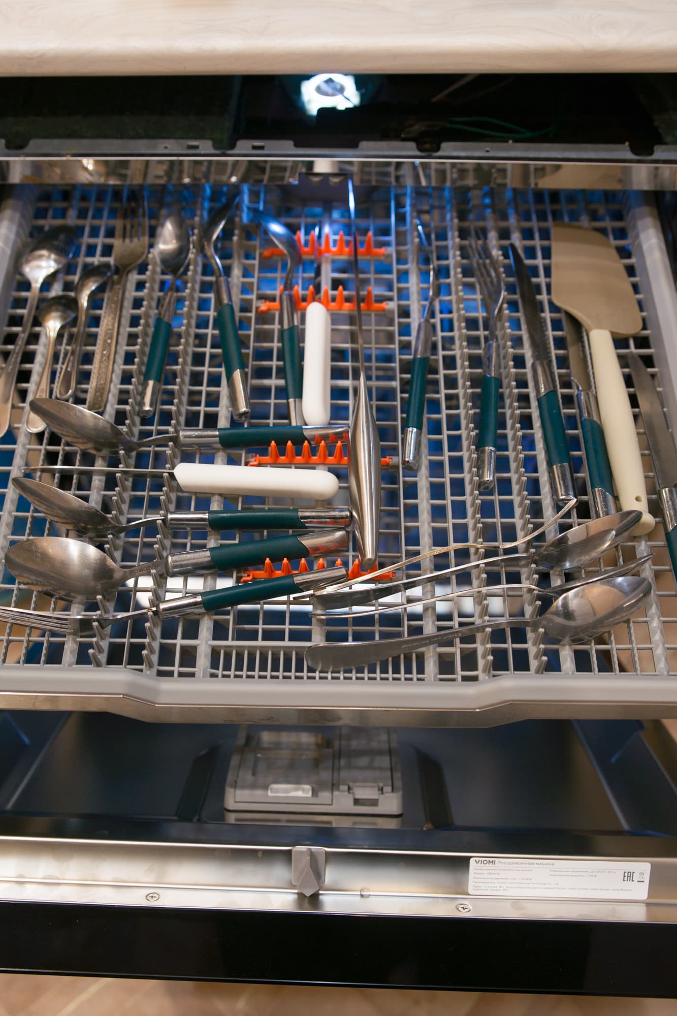 Столовые приборы моются на отдельном, самом верхнем уровне.