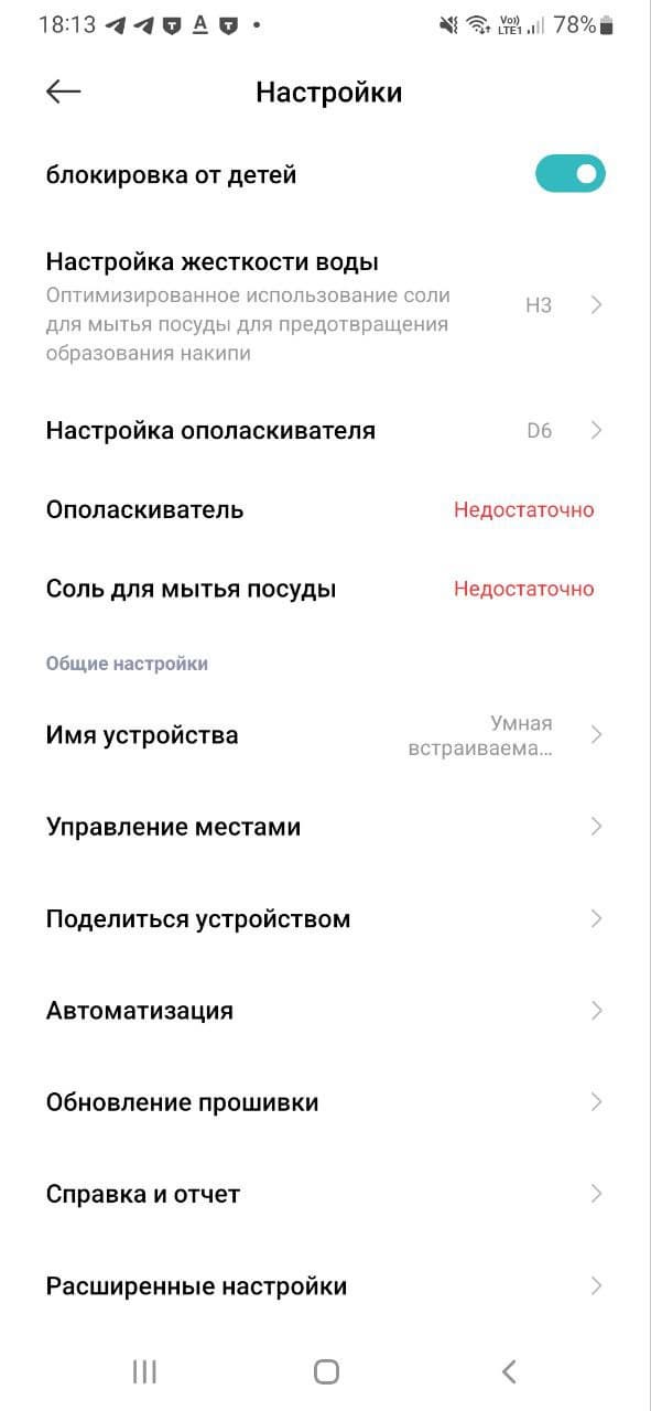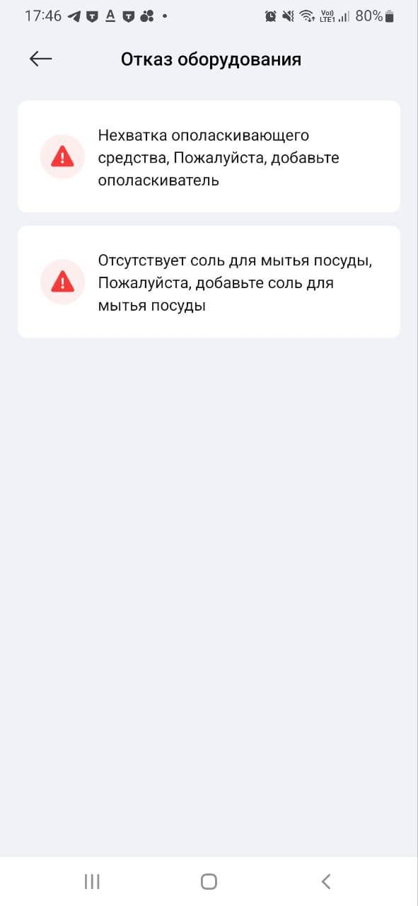Если резервуары соли и ополаскивателя пусты или в настройках уровень жесткости воды и подачи соли не отключен, на экране приложения постоянно будет высвечиваться предупреждение о проблеме.