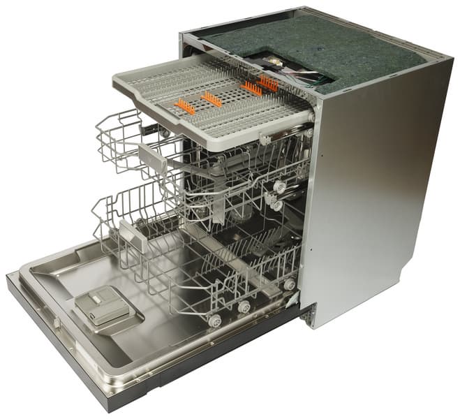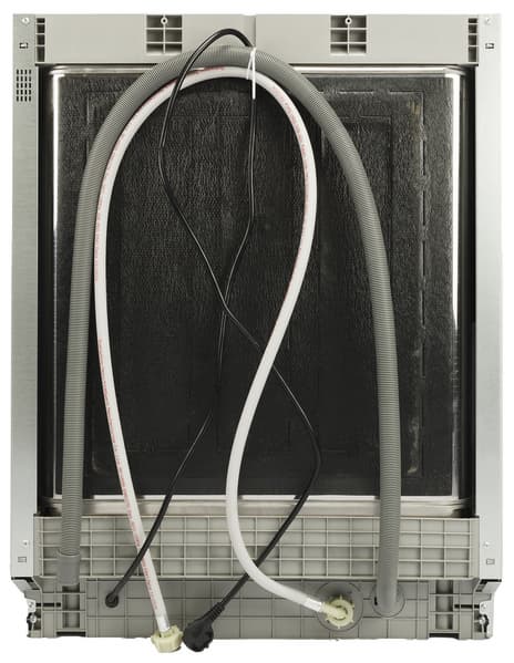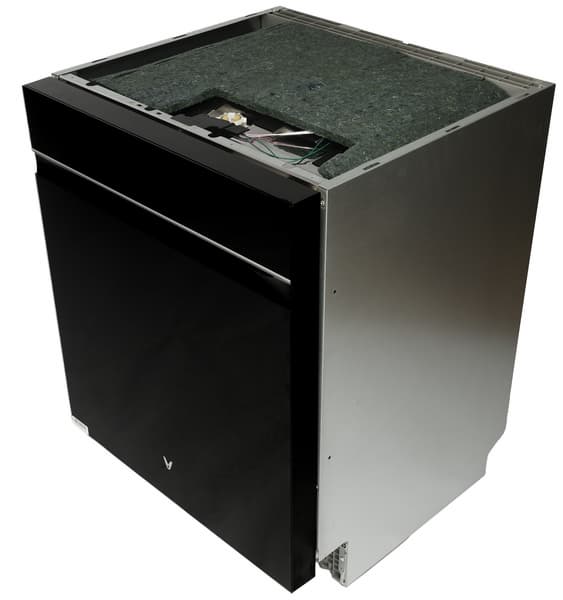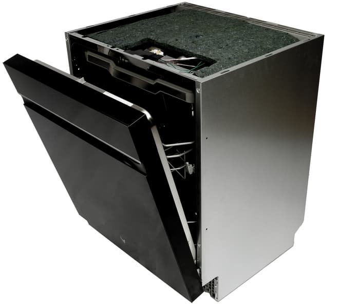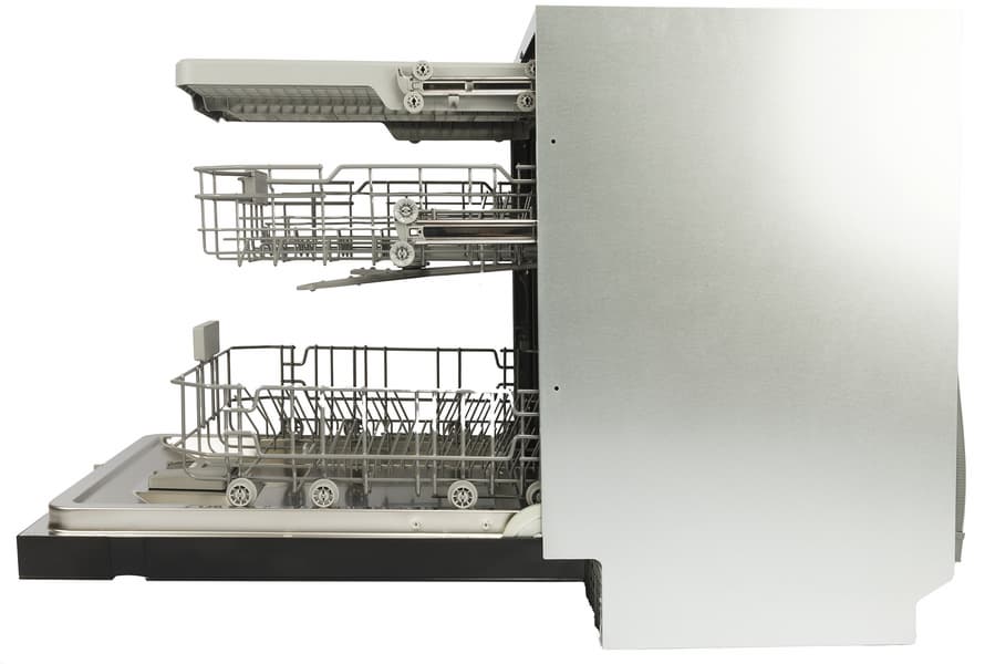 Боковые стенки устройства из неокрашенной стали ничем не примечательны. После установки посудомойки в кухонный гарнитур они будут полностью скрыты. Верхняя часть покрыта шумоизоляционным материалом.