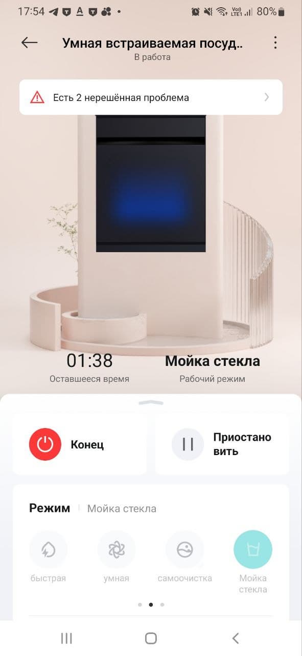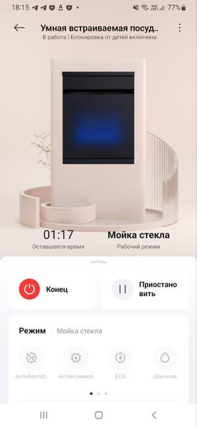 Для управления этой посудомоечной машиной производитель предлагает установить фирменное приложение Xiaomi Home. Программа позволяет управлять всеми устройствами, входящими в экосистему Xiaomi. Причем не только на территории квартиры где установлен прибор, но и на значительно большем расстоянии. Мы попробовали управлять посудомойкой, находясь в другом районе города на расстоянии около 10 км от устройства, и у нас всё получилось. Посудомойка была подсоединена по Wi-Fi к одному роутеру, а смартфон — к другому. Провайдеры при этом были разными.