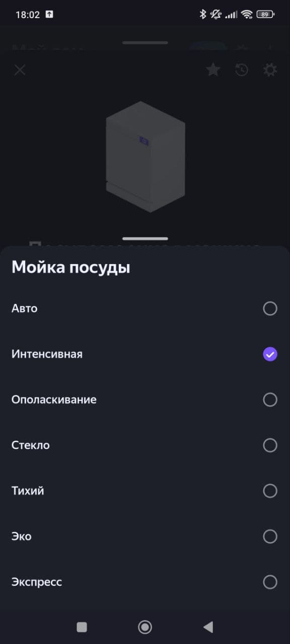 Здесь можно запустить режимы мойки, поставить блокировку панели, выяснить текущее состояние прибора (если запущен цикл мытья посуды) и запустить отложенные команды.