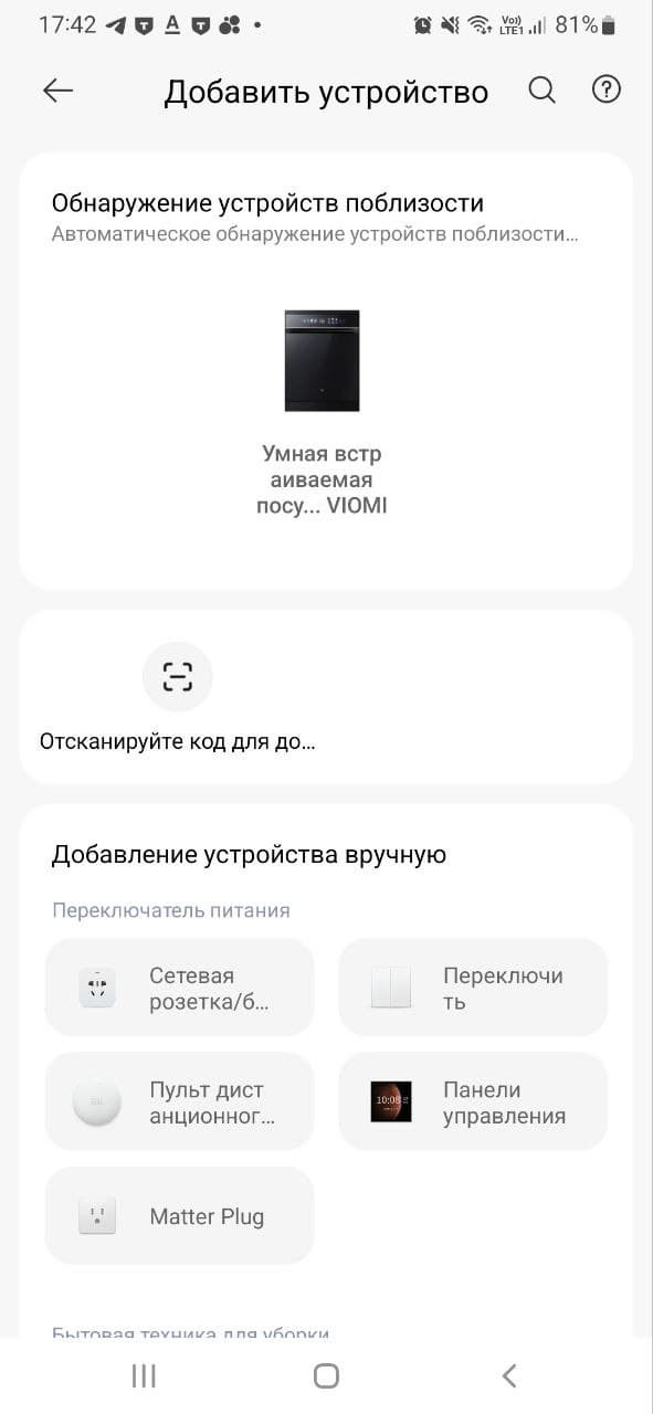 Для активации Wi-Fi на самой посудомойке одновременно нажимаем кнопки Самоочистка и Стерилизация и держим пока на дисплее не замигает значок Wi-Fi. После этого включаем на смартфоне Bluetooth, а в основном меню переходим на вкладку Кухня и в правом верхнем углу нажимаем на «+» — смартфон автоматически начинает искать поблизости «родное» устройство.