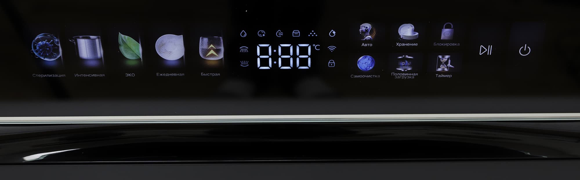 Из особенностей и одновременно плюсов мы отметили цветной дисплей с крупными сенсорами, трехуровневое распыление воды из пяти импеллеров, наличие подсветки бака, а также функцию поддержания свежести вымытой посуды в закрытой посудомойке до 7 дней, что, на наш взгляд, является отличной альтернативой автоматическому открыванию дверцы по окончании цикла.