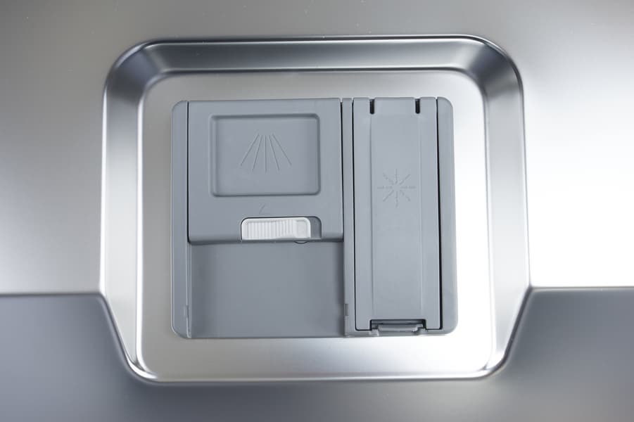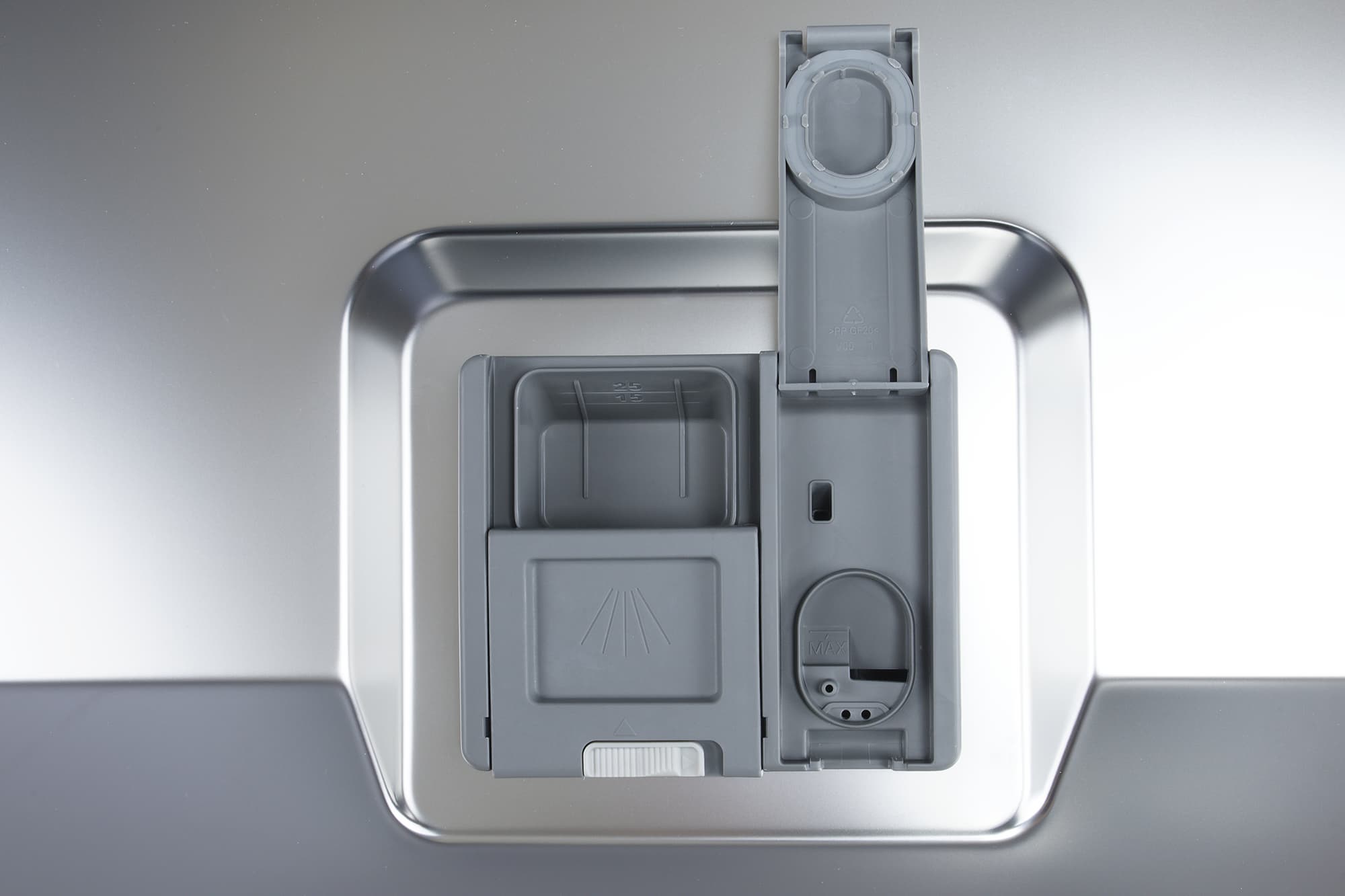 У контейнера для моющих средств два отделения: традиционный отсек для таблеток или специального порошка со сдвижной крышкой и емкость для ополаскивателя с откидывающейся крышкой.