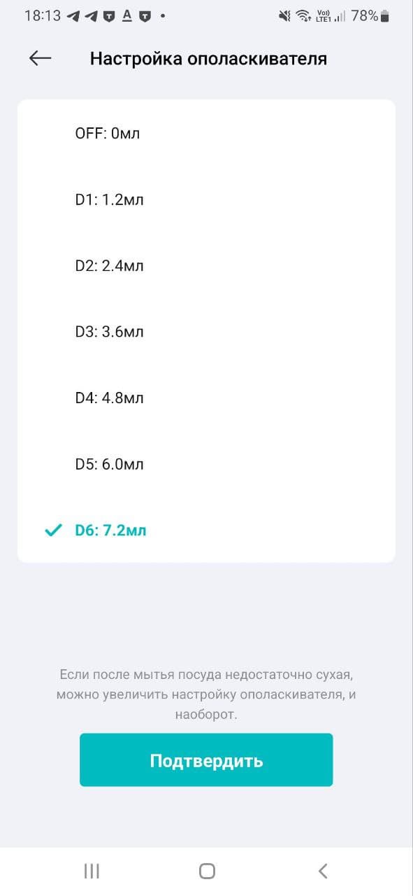 Некоторые режимы мойки в приложении и на панели управления названы по-разному, что слегка путает. Кроме тех, что есть на панели здесь мы нашли несколько дополнительных программ: для стекла (99 минут), для мойки овощей (17 минут) и морепродуктов (19 минут), предварительное ополаскивание (15 минут), отдельно сушку, а также настройку использования соли и ополаскивателя. Последние, в зависимости от уровня жесткости воды можно выставить на один из 6 режимов, в том числе и отключить полностью.