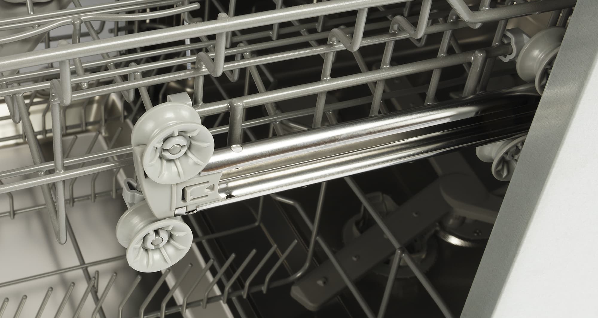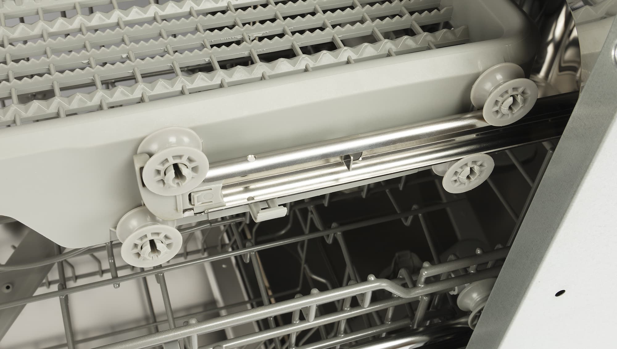 Все корзины опираются на ролики. Нижняя перемещается по углублениям в корпусе, средняя и верхняя — по выдвижным металлическим направляющим.