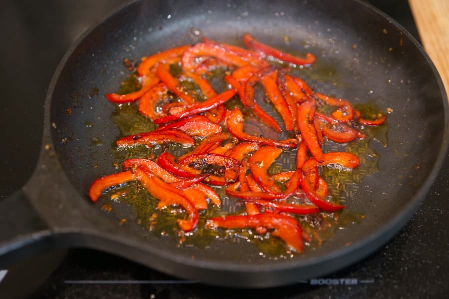 После карамелизации мы переложили говядину в другую емкость и отправили на сковороду болгарский перец.