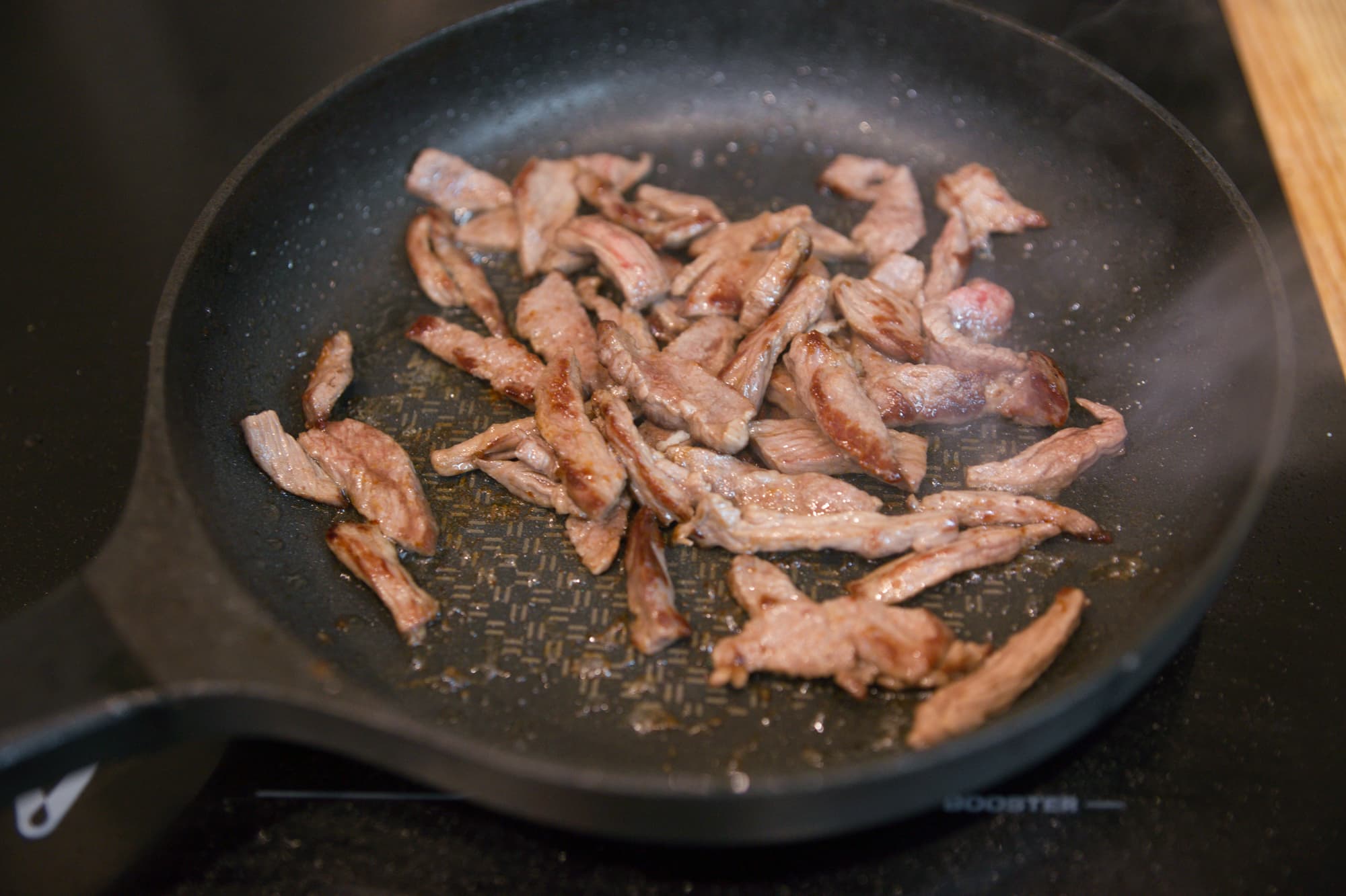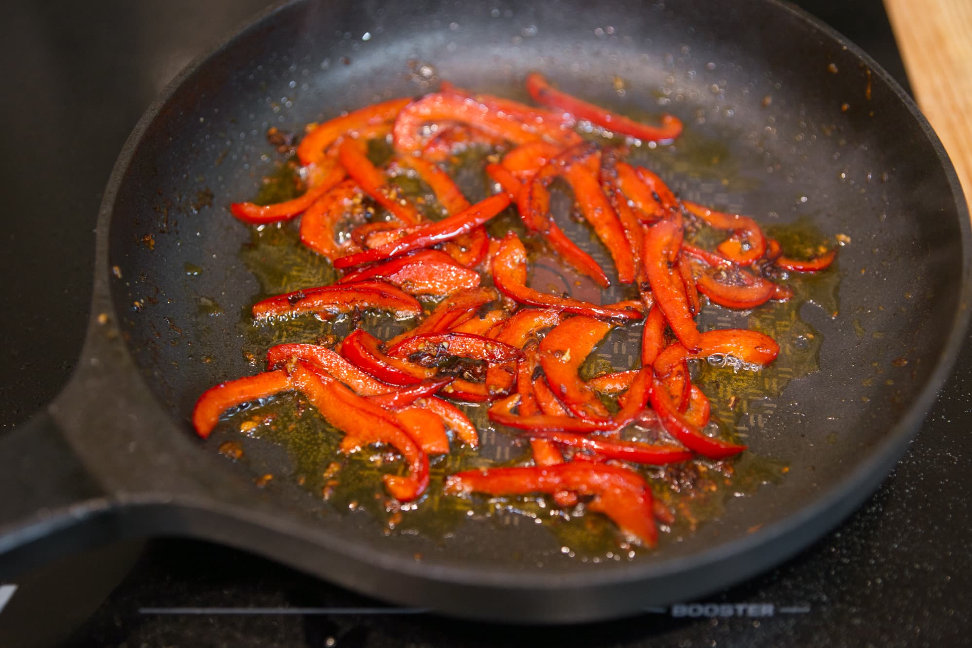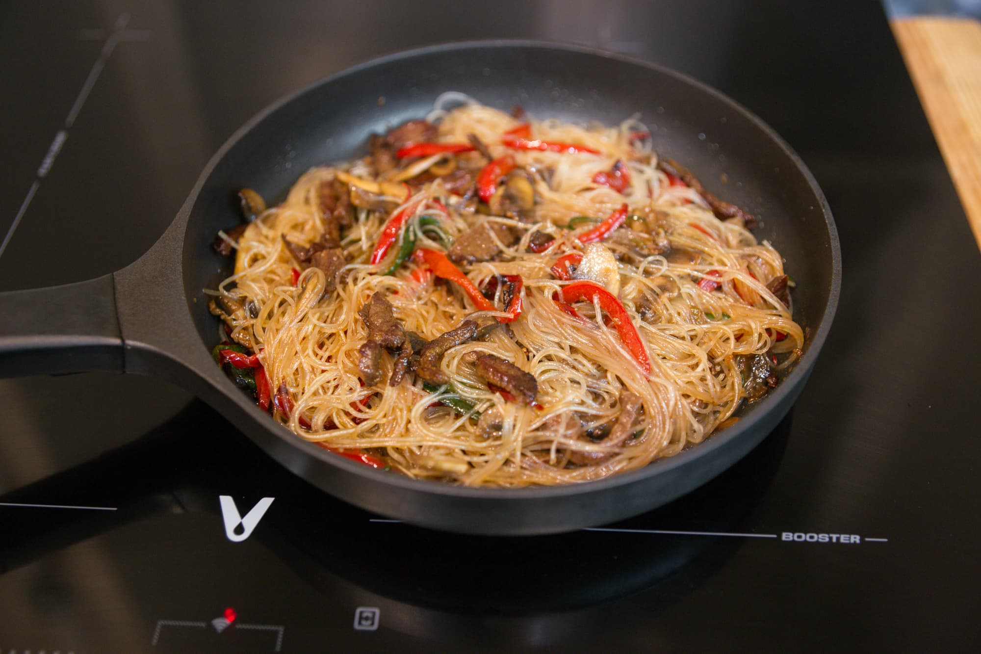 Обжаривание происходило в режиме Boost и на 9-й мощности. Процесс прошел быстро, все продукты именно поджарились, а не потушились, что особенно важно в этом блюде. Вышло отлично.