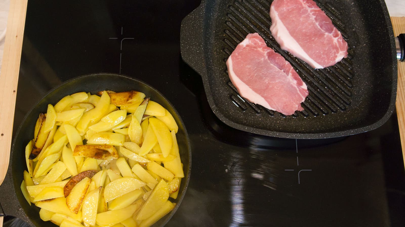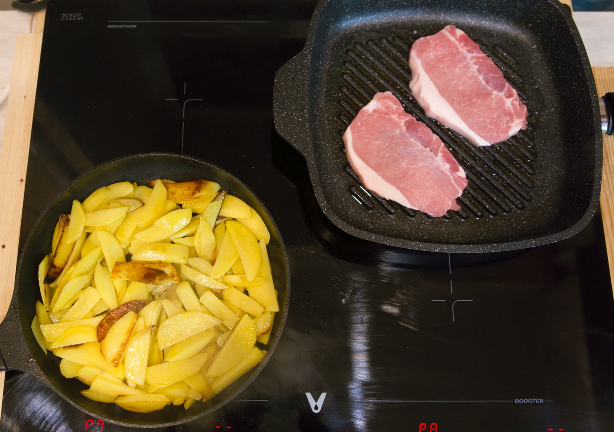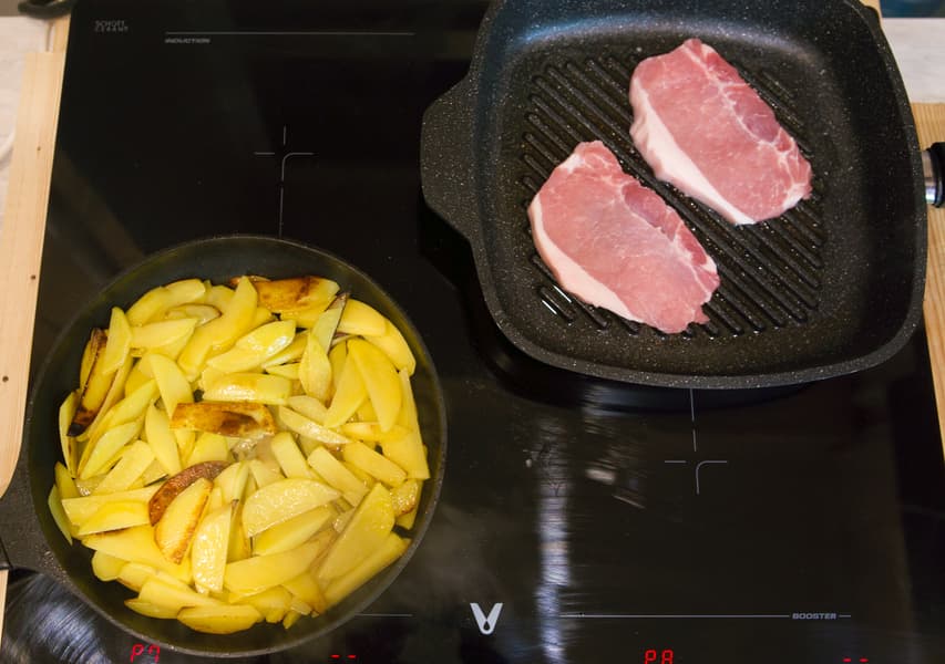 Обжаривание картофеля заняло у нас не более 20 минут. В середине процесса на другую конфорку мы поставили сковородку с парой кусочков свинины.