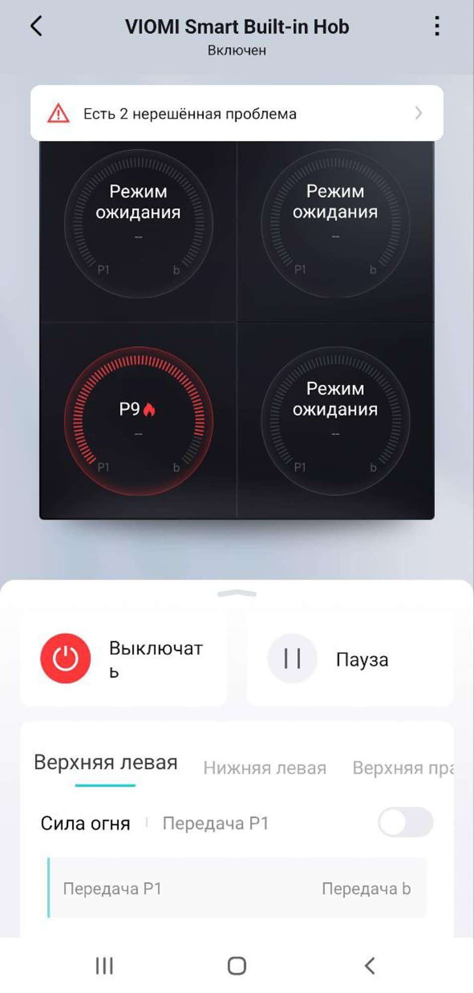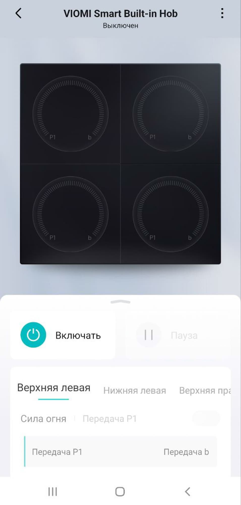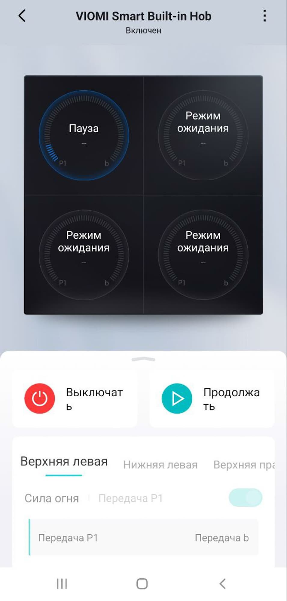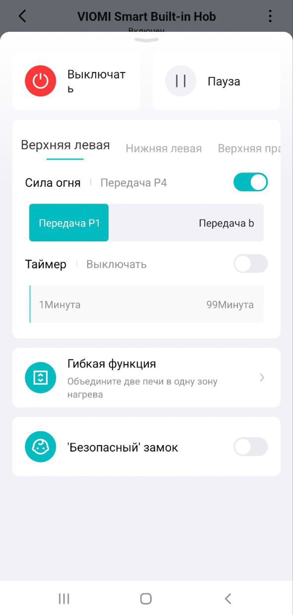 Приложение позволяет включать и выключать плиту, ставить блокировку сенсоров от случайных касаний и регулировать нагрев каждой зоны.