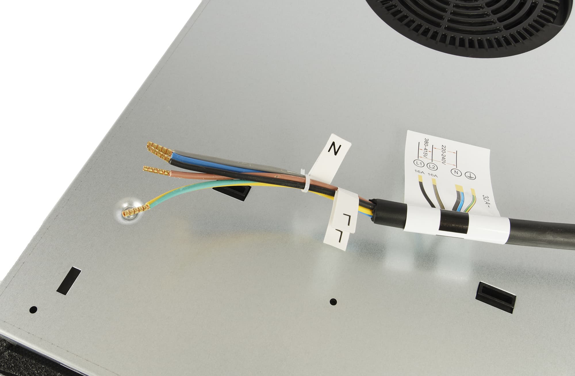 Дно выглядит традиционно — пара круглых вентиляторов, выход кабеля без вилки и наклейка с технической информацией.