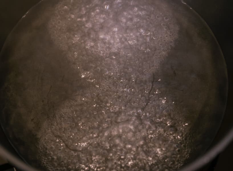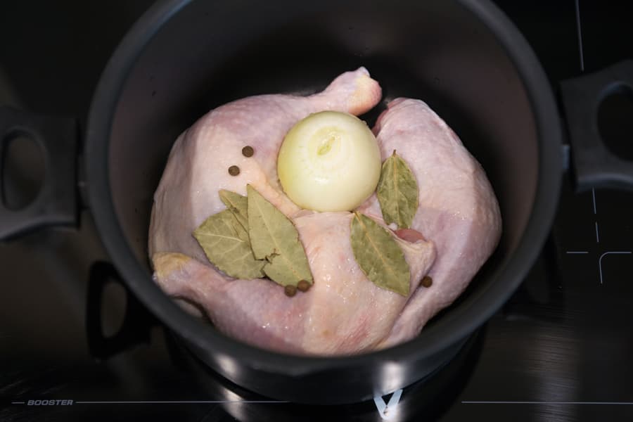 Залили водой и поставили закипать под крышкой на ближнюю левую конфорку в режиме Boost. В этом тесте нам интересна способность варочной панели к длительному стабильному поддержанию невысокой температуры. Для бульона требовалось легкое едва заметное кипение при 89—93 °C.