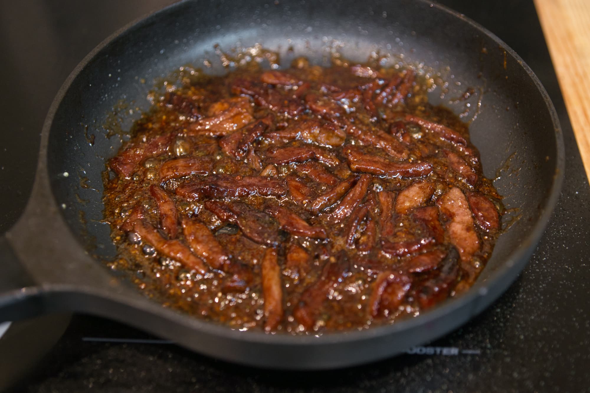 Ближе к концу обжаривания к мясу добавились мед, соевый соус и сушеный молотый имбирь.