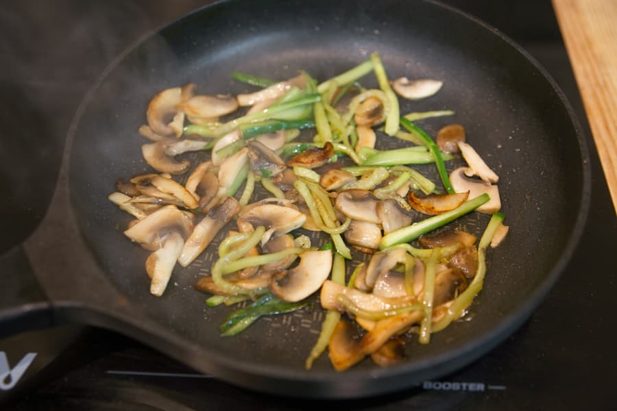 Теперь посмотрим, как панель ведет себя при быстром сильном обжаривании продуктов. На раскаленной сковороде сначала обжаривались шампиньоны и нарезанный соломкой огурец.