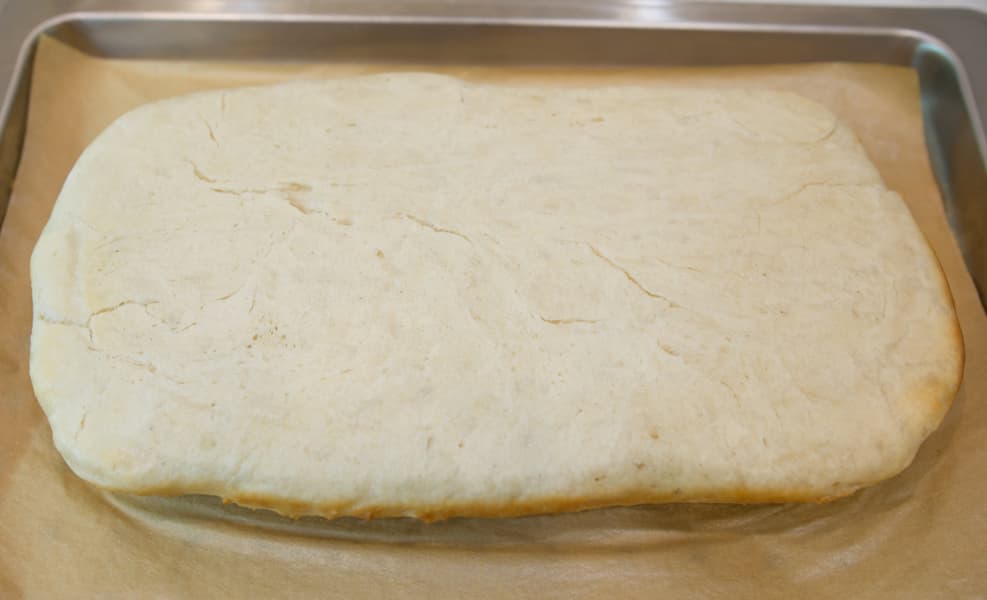 Мы обмяли его со всех сторон и поставили на расстойку еще раз в том же режиме. После повторного увеличения перенесли тесто на противень с отверстиями, сформировали относительно плоскую лепешку и отправили будущий хлеб в камеру.