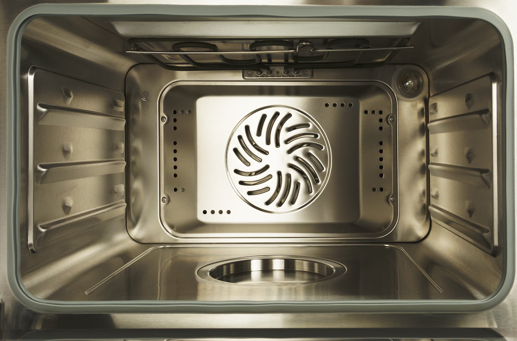 50-литровая рабочая камера покрыта нержавеющей сталью. На задней стенке мы видим решетку вентилятора. Вокруг нее — небольшое количество круглых отверстий. В правом верхнем углу виднеется лампочка, освещающая камеру во время работы. На боковых стенках — выпуклые направляющие, для установки емкостей на трех уровнях.