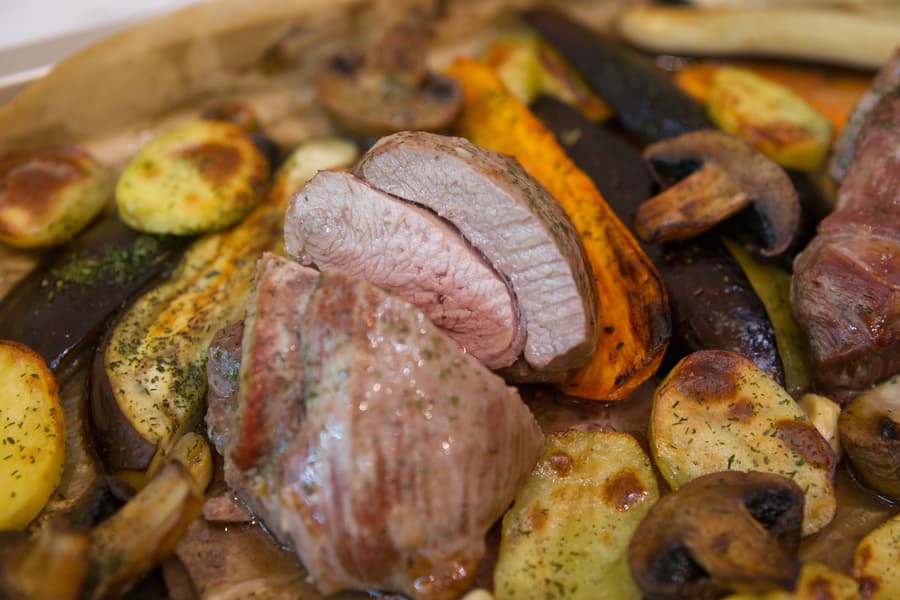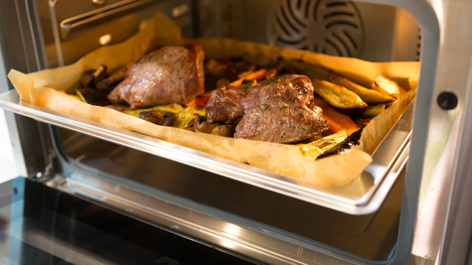 Для овощей и куриного филе мы выбрали Длительное приготовление на пару́ при 110 °C на 30 минут. Этого времени хватило, чтобы все продукты на противне полноценно приготовились и остались сочными.