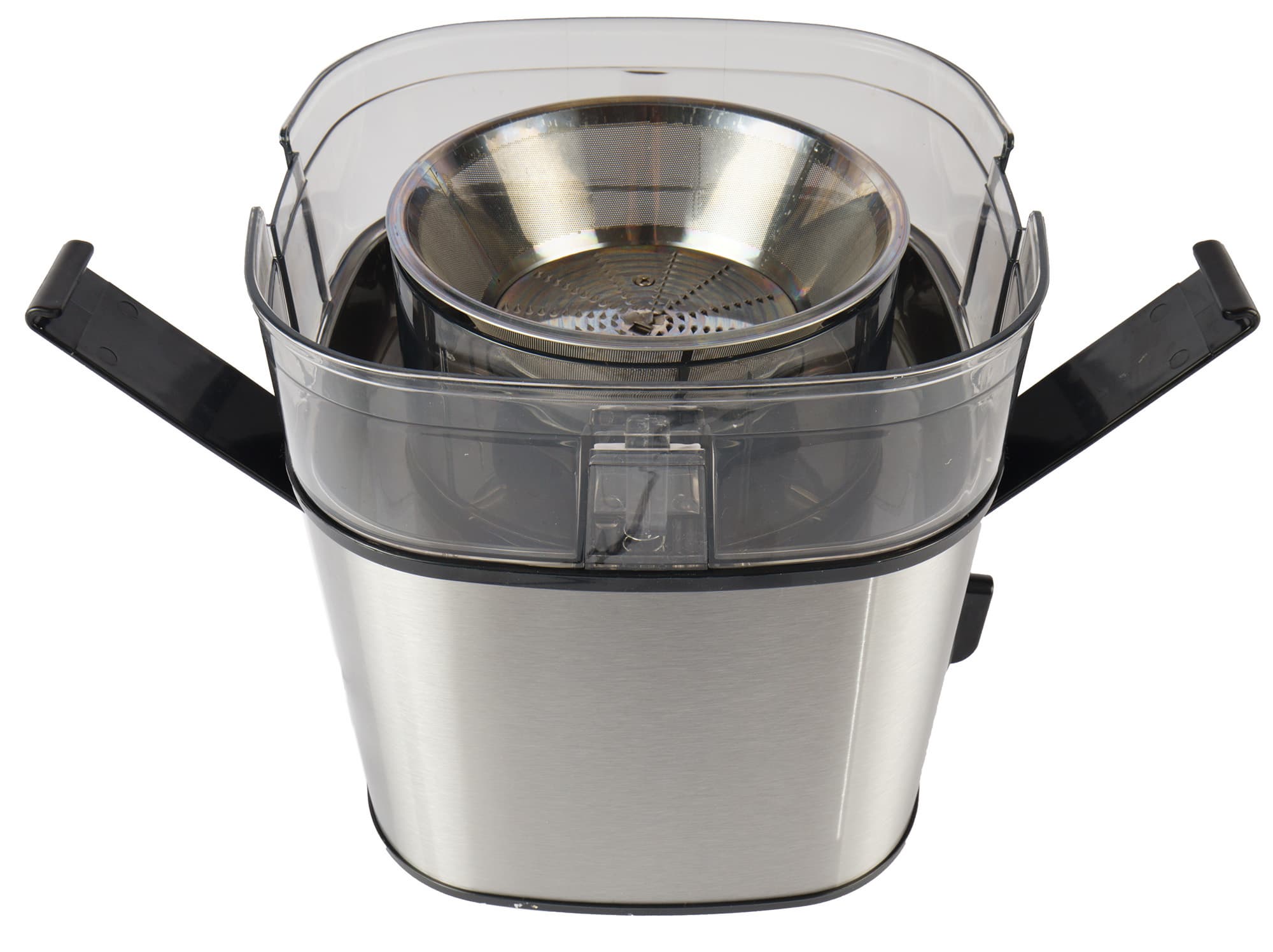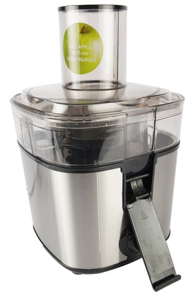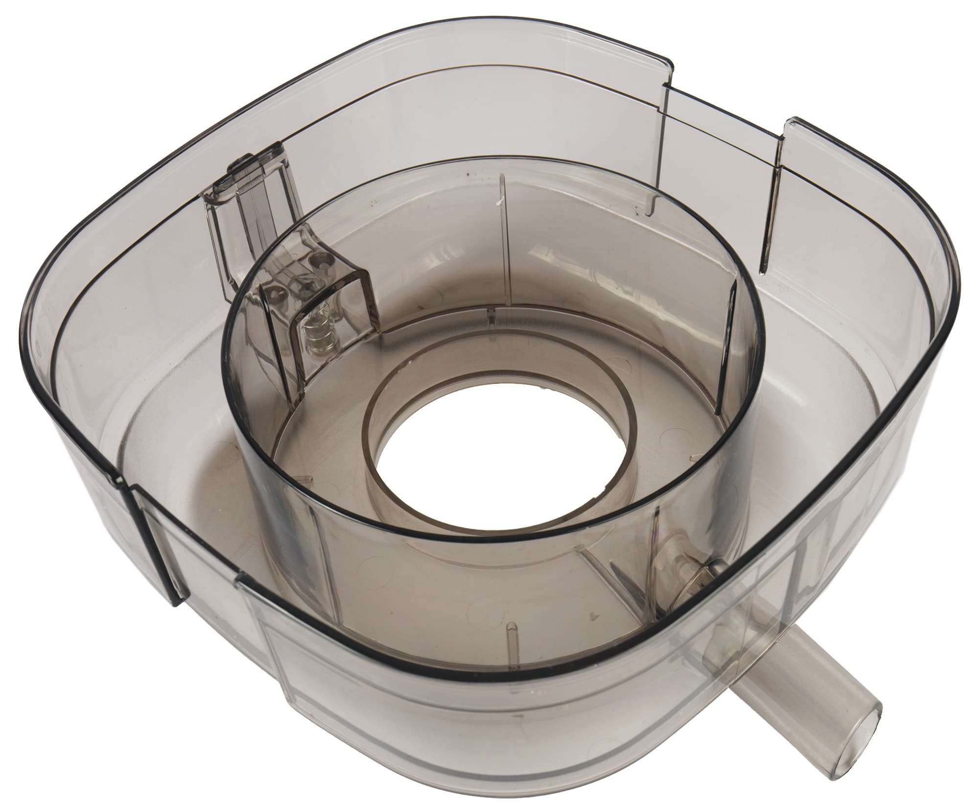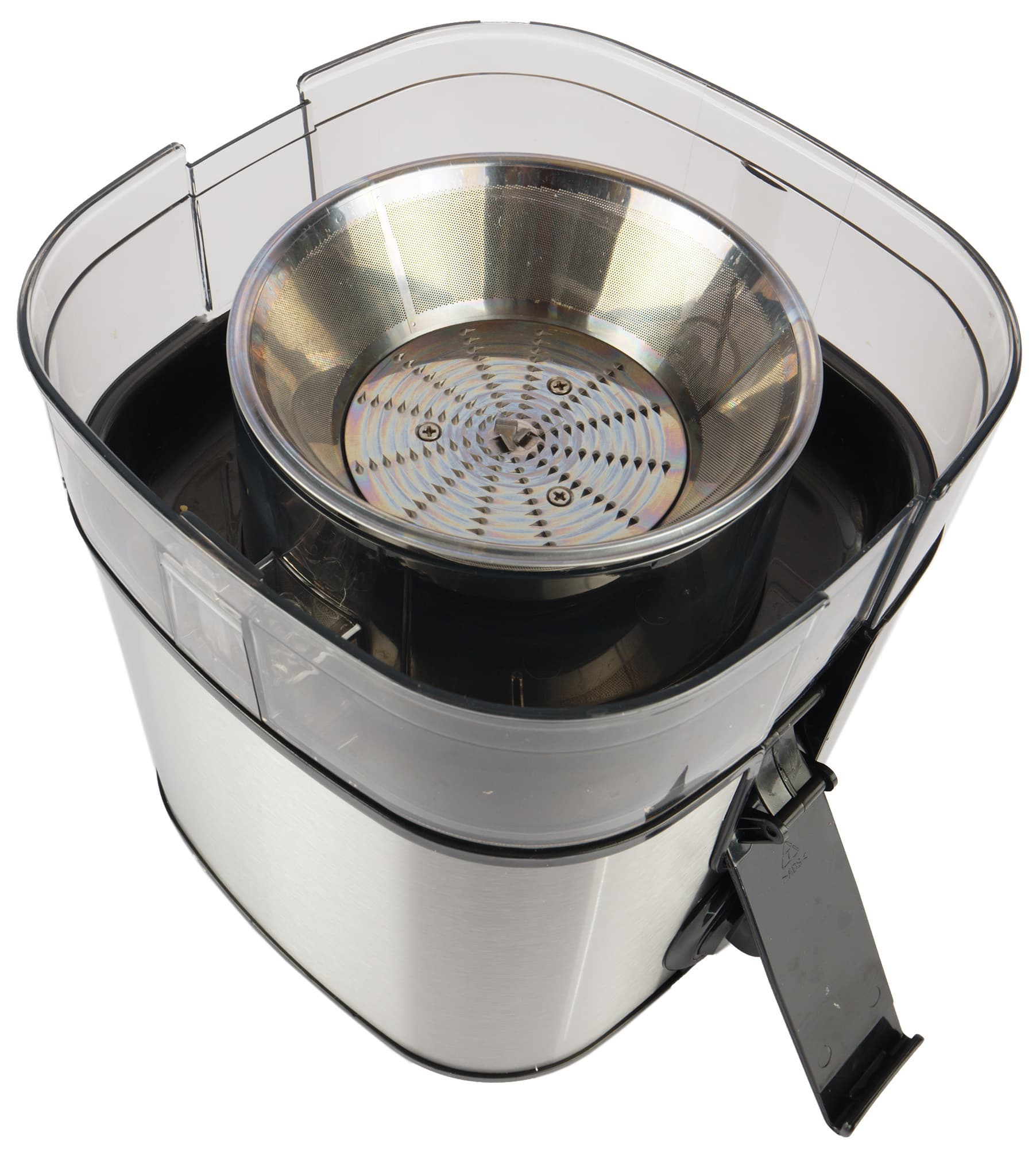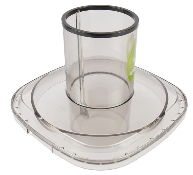 Сверху на моторный блок устанавливается контейнер для сбора жмыха, сверху на него — крышка с «трубой» для подачи сырья. Оба элемента сделаны из прозрачного пластика.