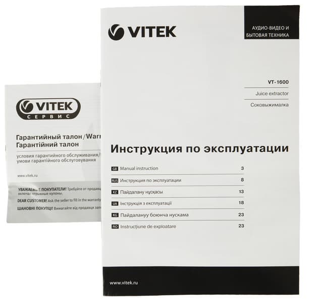 Прибор поставляется в картонной коробке с двумя пенопластовыми вставками внутри, между которыми расположены упакованные в полиэтиленовые пакеты полностью собранная соковыжималка, кувшин для сока, инструкция и гарантийный талон.