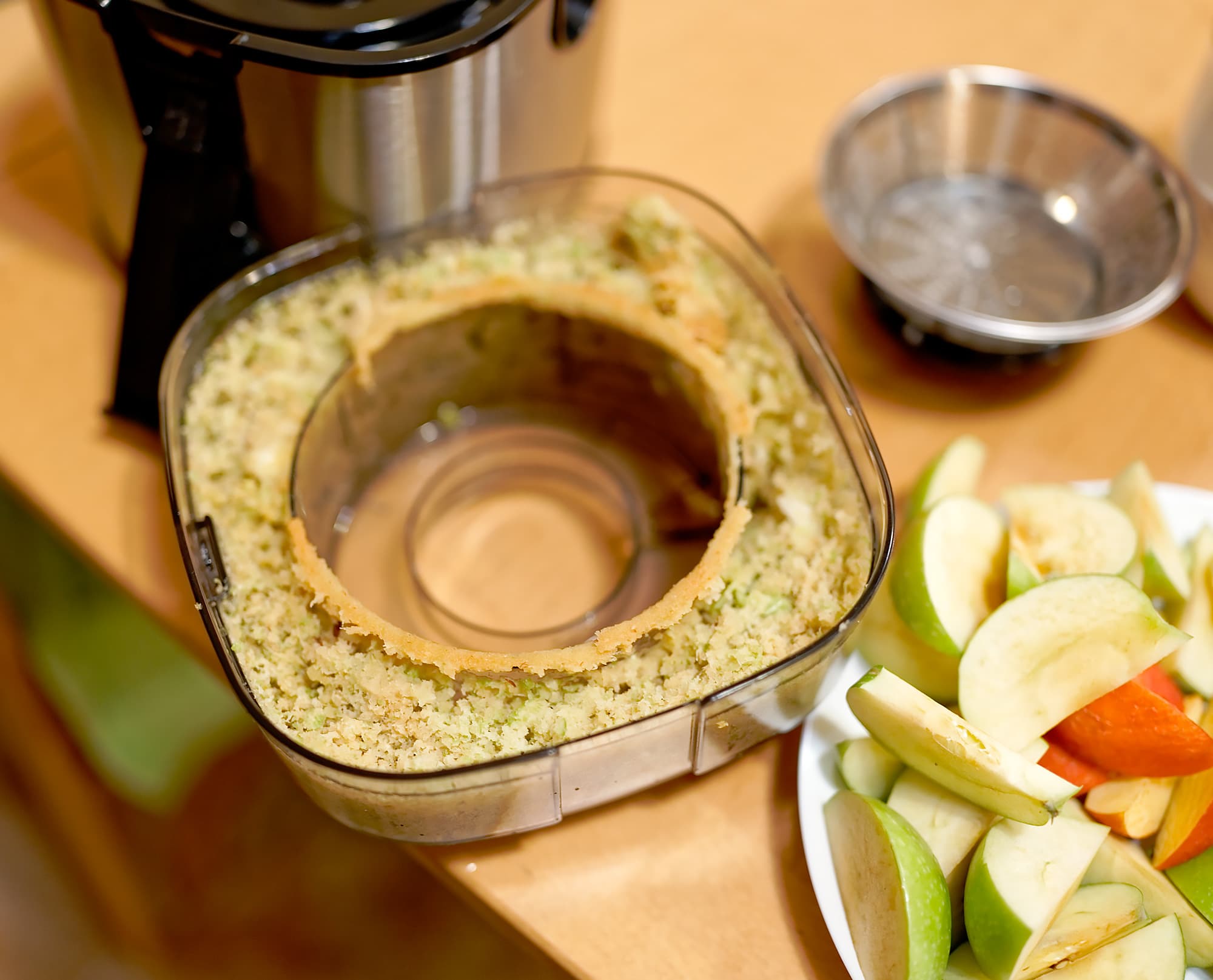 Опыт с отжимом сока из яблок целиком (мы специально отобрали такие, которые пролезали в отверстие и только удалили у них плодоножки) оставил двойственное впечатление. Во-первых, примерно на середине, когда диаметр контакта яблока с теркой максимален, двигателю эта нагрузка совершенно однозначно не нравится: вращение замедляется, соковыжималку начинает ощутимо «потряхивать», а один раз нам даже удалось добиться срабатывания защиты двигателя от перегрева (заодно убедились, что она работает). Во-вторых, один раз недотертый кусок яблока после удаления толкателя из шахты «выстрелил» наружу, едва не попав тестировщику в глаз. Ну и в-третьих, перемалывание яблок «вместе с будками» (т. е. без удаления сердцевины и семечек) делает цвет сока намного менее эстетичным: он приобретает коричневатый, землянистый оттенок. В общем, большой диаметр горловины — это, конечно, полезно, но пихать туда что попало, руководствуясь единственно подходящим диаметром — нерационально ;)