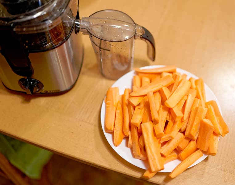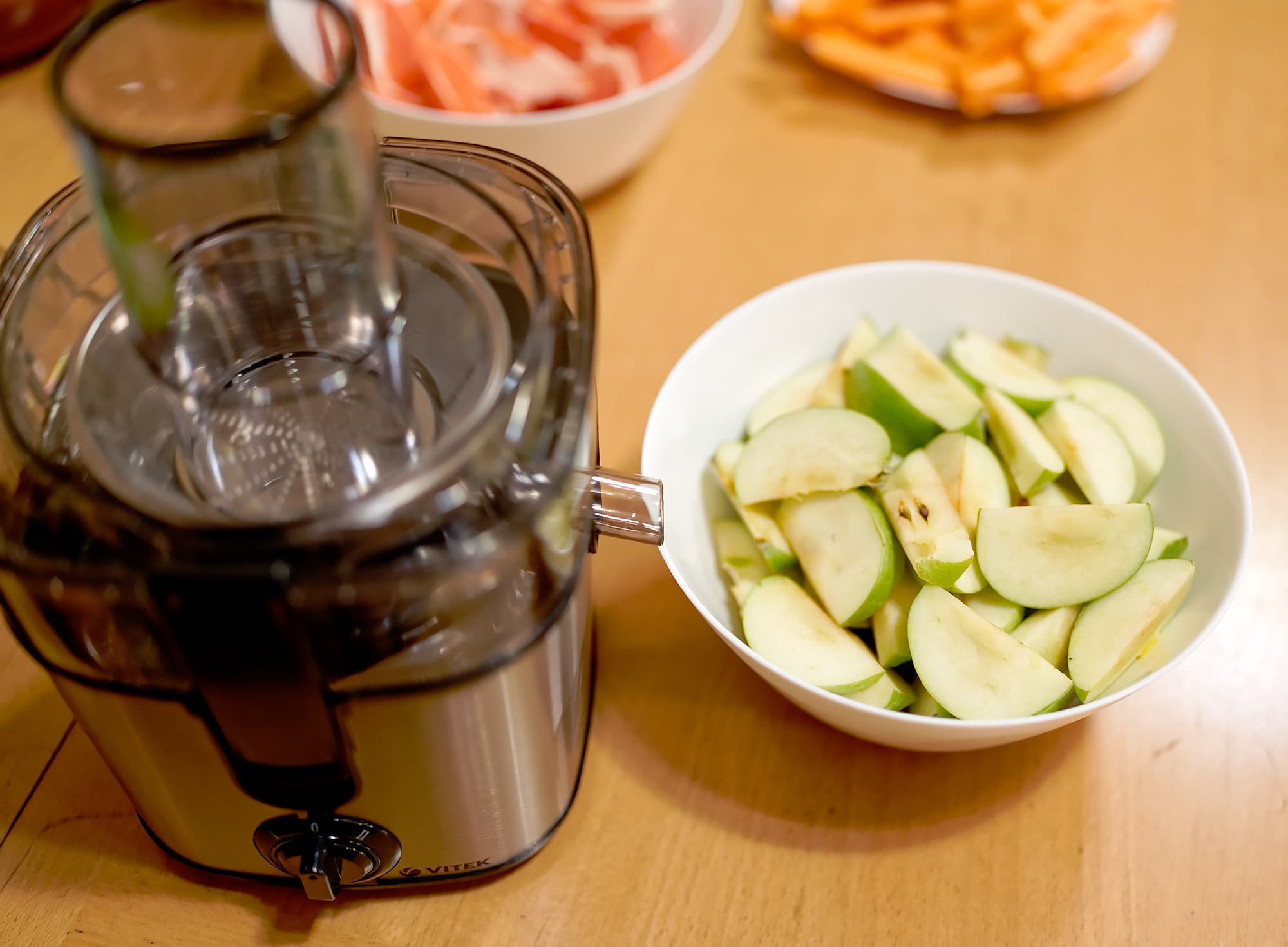 Поскольку результат с цельными яблоками у нас уже был, для второго теста попробовали их все-таки нарезать. Условия тестирования стандартные: сколько сока получится из 1 кг исходного сырья и за какое время.