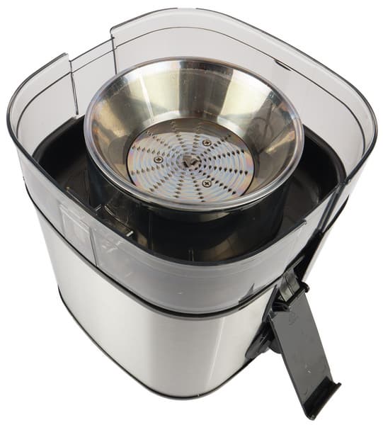 Неожиданное следствие компактности конструкции состоит в том, что опорожнение контейнера со жмыхом оказывается несколько более сложной операцией, чем мы привыкли: если у многих других центробежных соковыжималок его достаточно просто «отстегнуть» от прибора и вытряхнуть — то здесь приходится делать полную разборку: освободить два зажима, снять крышку, потом снять отжимающую сетку, и только потом вынуть контейнер и опорожнить его. При этом объем его не так уж велик — чуть меньше литра, так что при переработке большого количества продукции проводить вышеописанную операцию придется довольно часто.