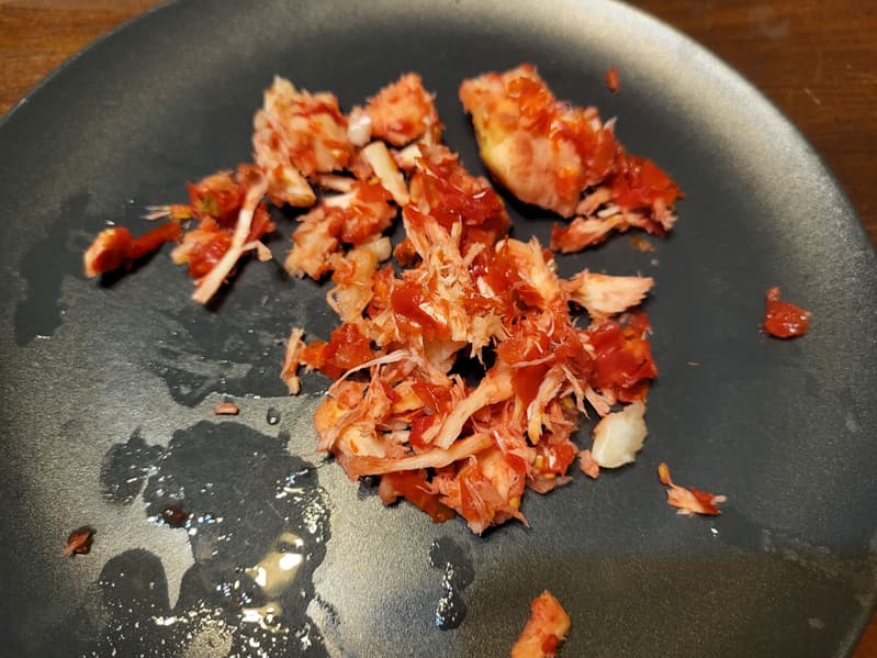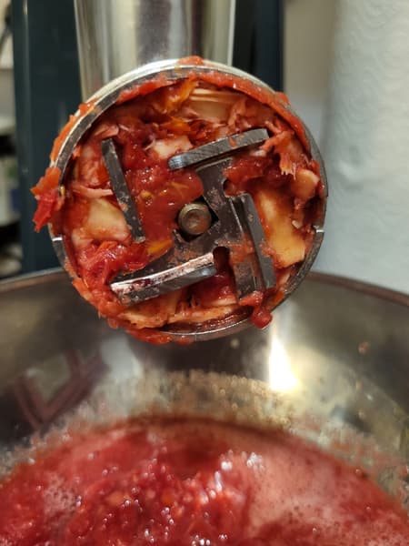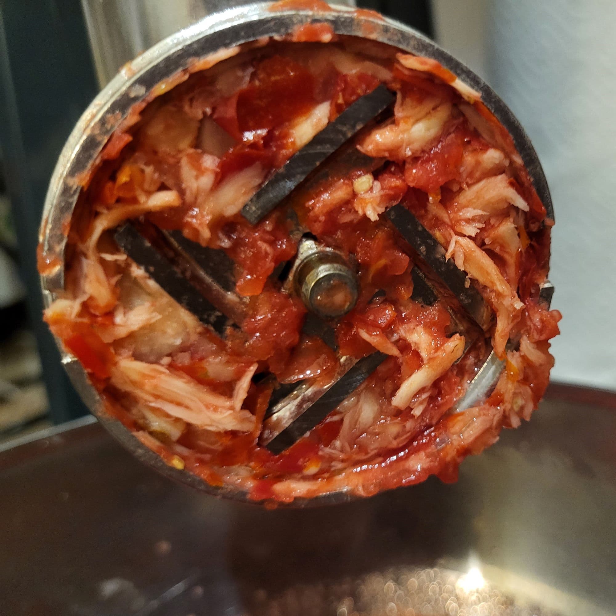 К сожалению, хрен заклинил мясорубку намертво, и использование реверса в этом случае не помогло. Прибор нагрелся до 43 градусов, стал снова пахнуть подгорающей смазкой и чудом не умер. На фото ниже вы видите хрен с помидорами в мясорубке: