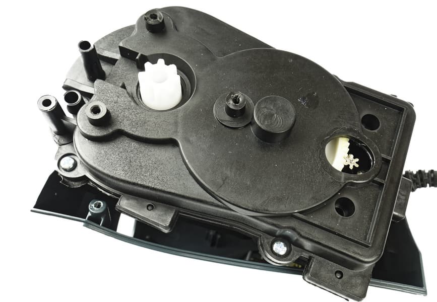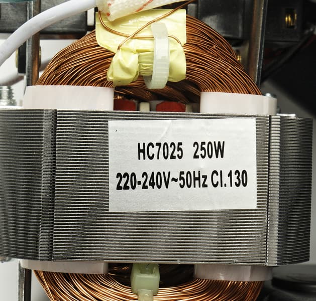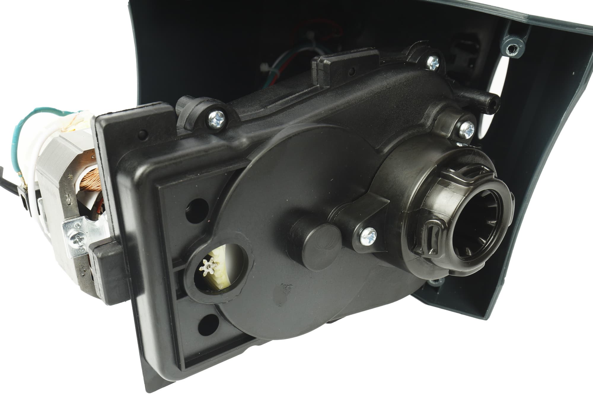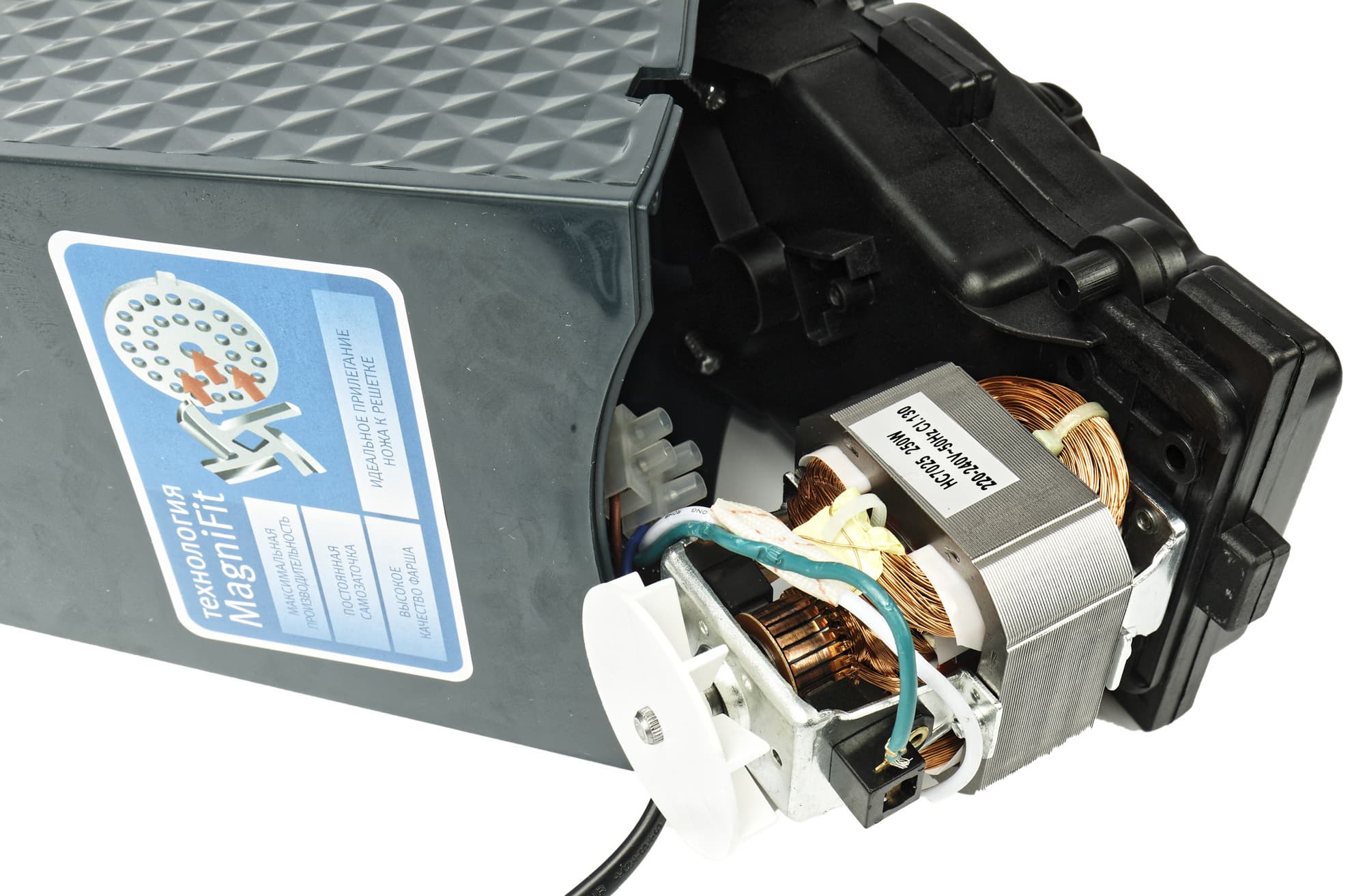 После внешнего осмотра мы разобрали моторный блок. Внутри корпуса находится двигатель мясорубки и охлаждающий его вентилятор.