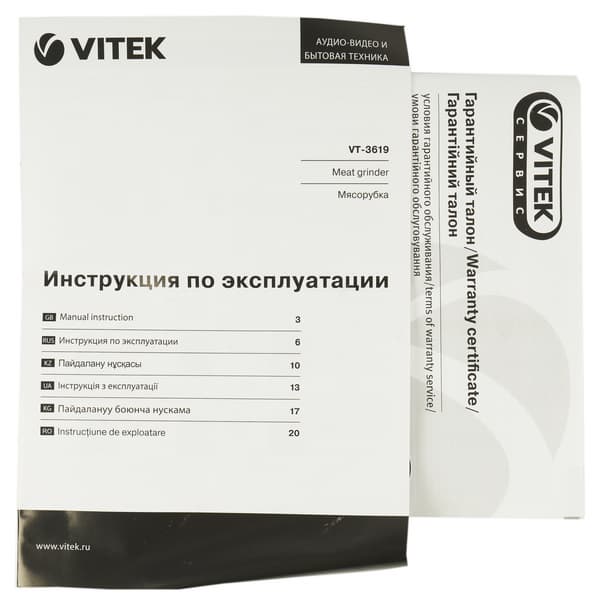 Руководство по эксплуатации Vitek VT-3619 — брошюра формата А5, напечатанная на плотной глянцевой бумаге, на шести языках: английском, русском, казахском, украинском, киргизском и румынском.