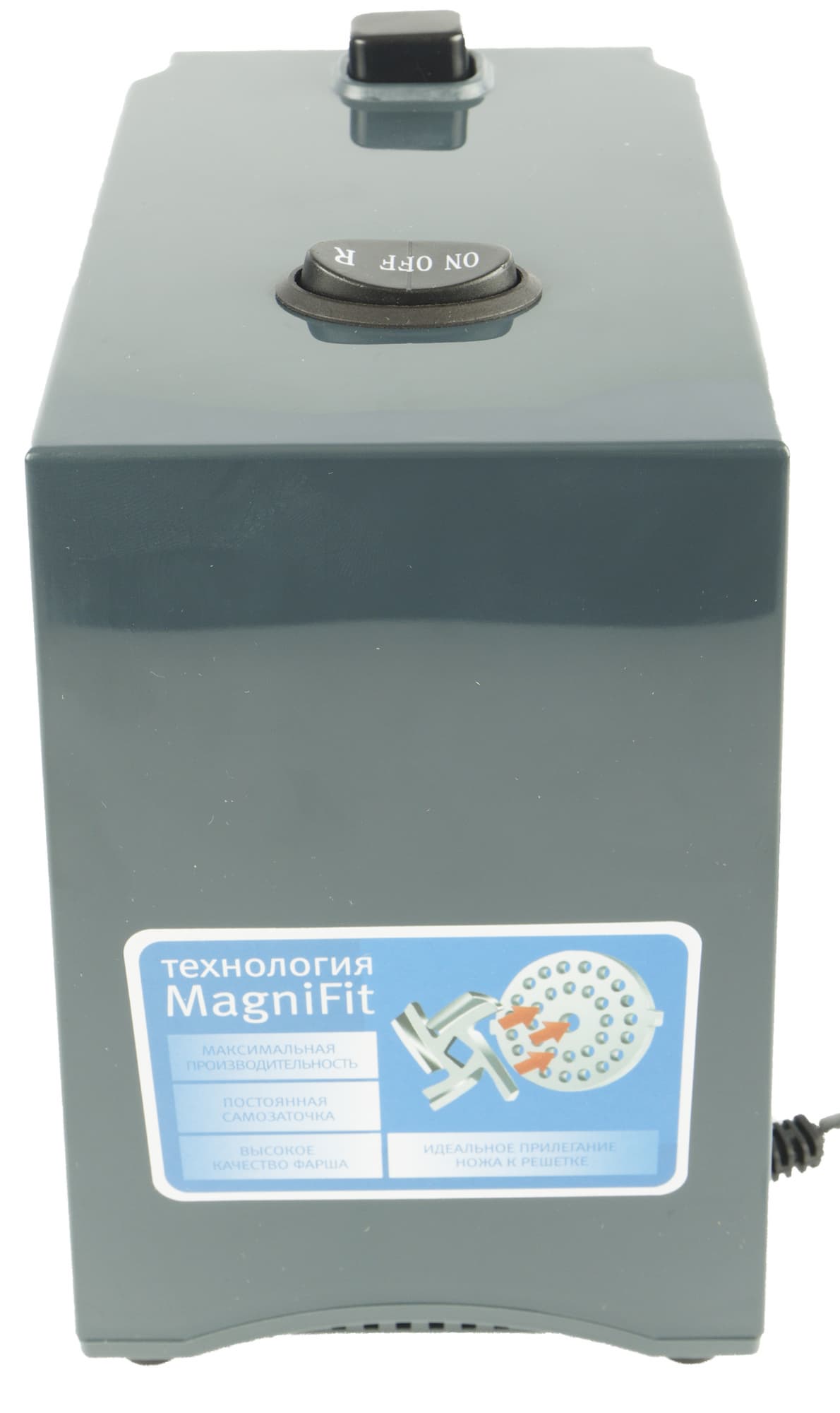 На задней части прибора мы видим наклейку, рекламирующую «уникальную технологию заточки и шлифования MagniFit, ножи и диск мясорубки прилегают друг к другу максимально плотно, в результате чего фарш имеет однородную текстуру» (информация с сайта производителя). На наклейке написана следующая информация: «максимальная производительность; постоянная самозаточка; высокое качество фарша; идеальное прилегание ножа к решетке».