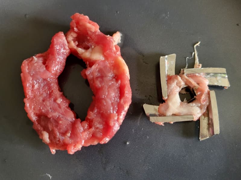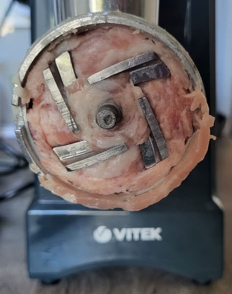С полкило такой не очень простой говядины мясорубка справилась тоже за 1 минуту, оставив немного жил на ноже и мяса за ножом.