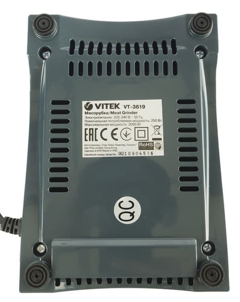 На нижней части мясорубки находятся прорезиненные ножки (о которых чуть больше мы скажем в разделе «Эксплуатация»), а также вентиляционные отверстия для отвода нагретого воздуха от мотора.