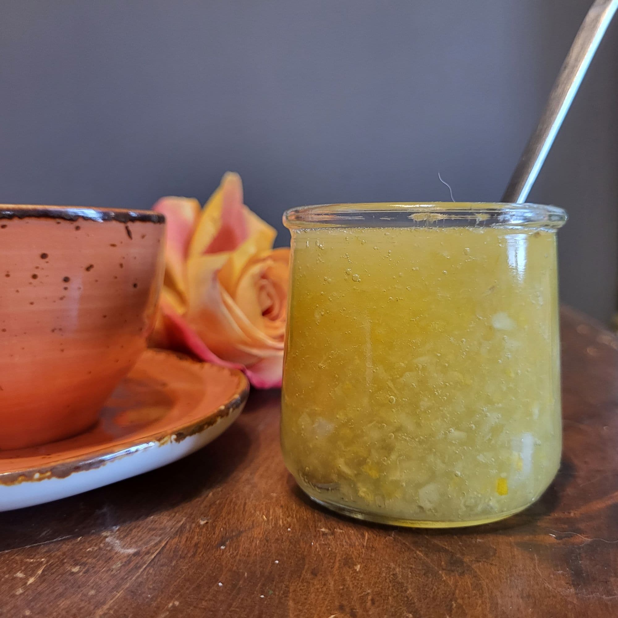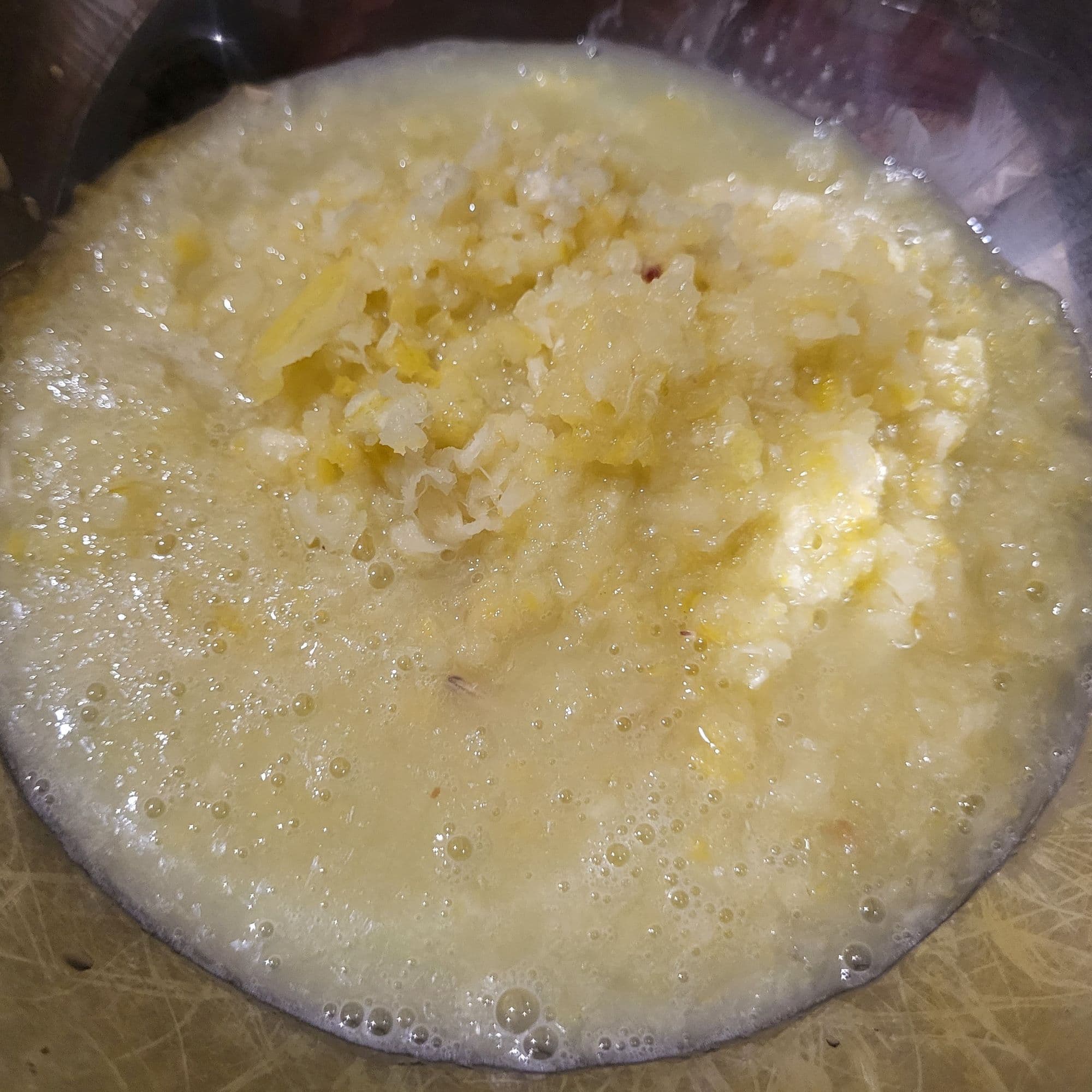 В процессе перемалывания лимонов выделилось очень много сока, что отчасти видно на фото: густая часть в центре, лимонный сок по краям.