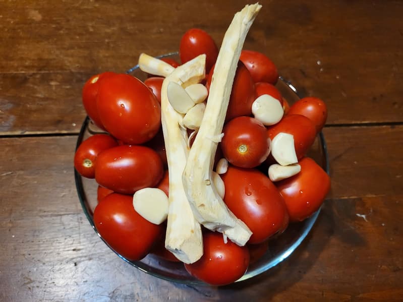 Мы взяли 2 кг помидоров, 200 г хрена и чуть меньше половины головки чеснока.