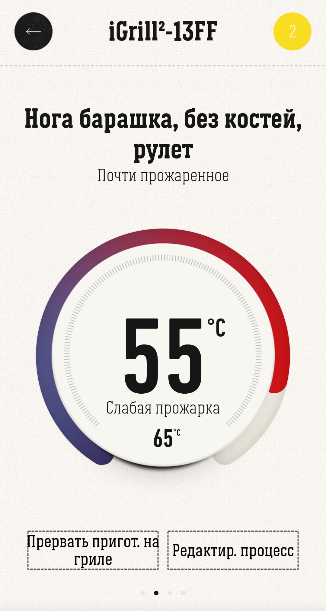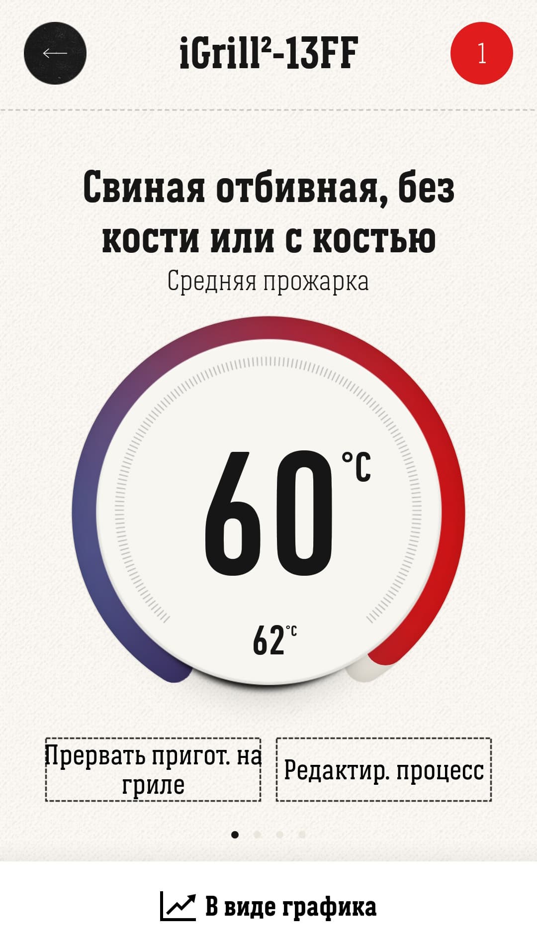 Как видите, мы наблюдаем наименование подключенного устройства, номер датчика (в правом верхнем углу), наименование блюда, выбранную степень прожарки, текущую температуру и температуру окончания процесса. Сейчас еще слишком рано, но когда температура станет побольше, под текущей температурой станет отображаться степень готовности на данный момент времени.