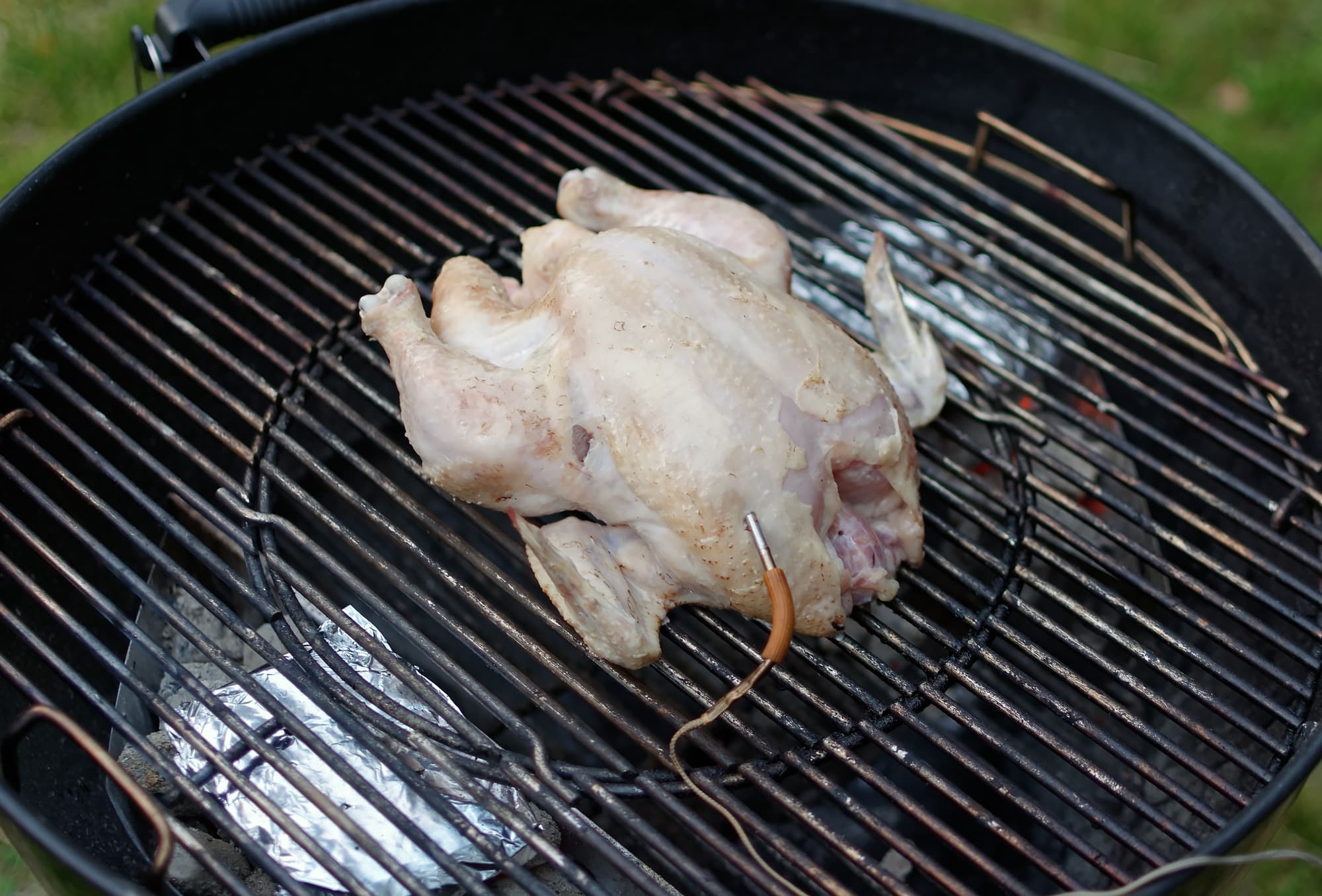 На этот раз снова использовали iGrill 2 с двумя щупами: заодно понаблюдаем за тем, насколько равномерно растет температура внутри. Предлагаемые приложением отрубы не подошли в точности: шеи там не было.